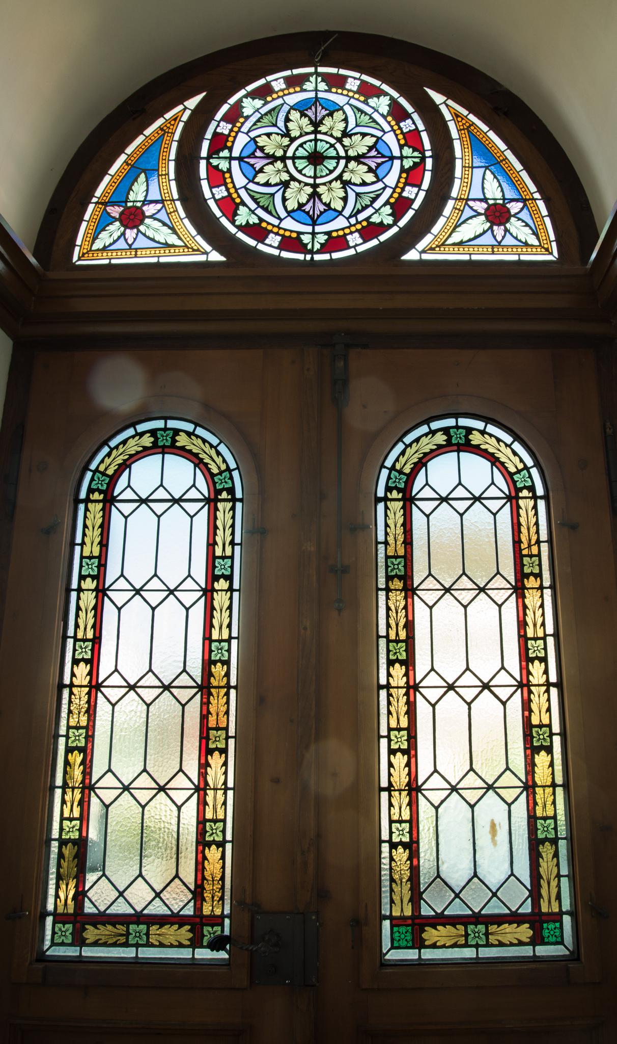 Das Nordportal weist eine Innen- und eine Aussentüre mit je zwei verglasten Türflügel auf. Die Aussentür ist mit einer Lünette bekrönt. Der Windfang öffnet sich ausserdem an seinen beiden Seiten in je einem Rundbogenfenster (vgl. TG_2389). Die Türverglasungen zeigen von Blattornamenten gerahmte Schweizerrauten, die beiden seitlichen Rundfenster zusätzlich mit einem Astwerkbogen und einem Pinienzapfen geschmückte Bogenfelder. Die Lünette zeigt eine Vierpassmotiv mit Blättern, umfasst von einer roten Bordüre. Die Zwickelfelder sind mit roten Rosetten in einer gelben Bordüre besetzt.