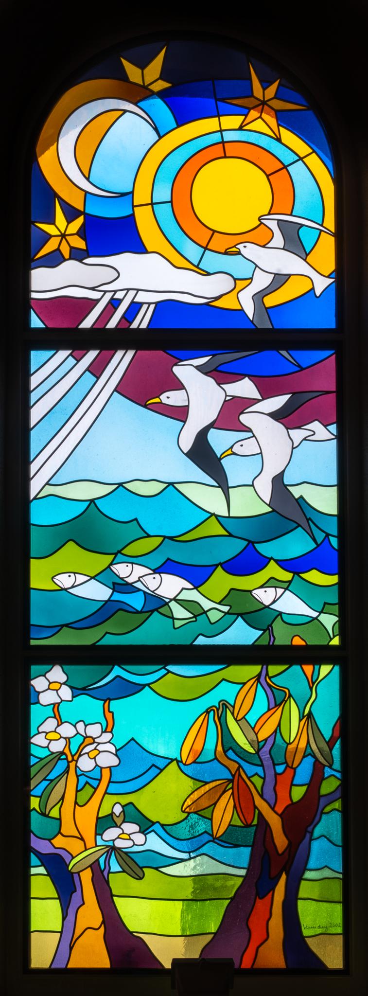 Rundbogenfenster mit Darstellung der Schöpfung. Im Vordergrund stehen Bäume, dahinter ist das Meer mit Fischen zu sehen, darüber fliegen Möwen. Im Bogenrund sind Sonne, Mond und Sterne sowie eine Wolke zu sehen.