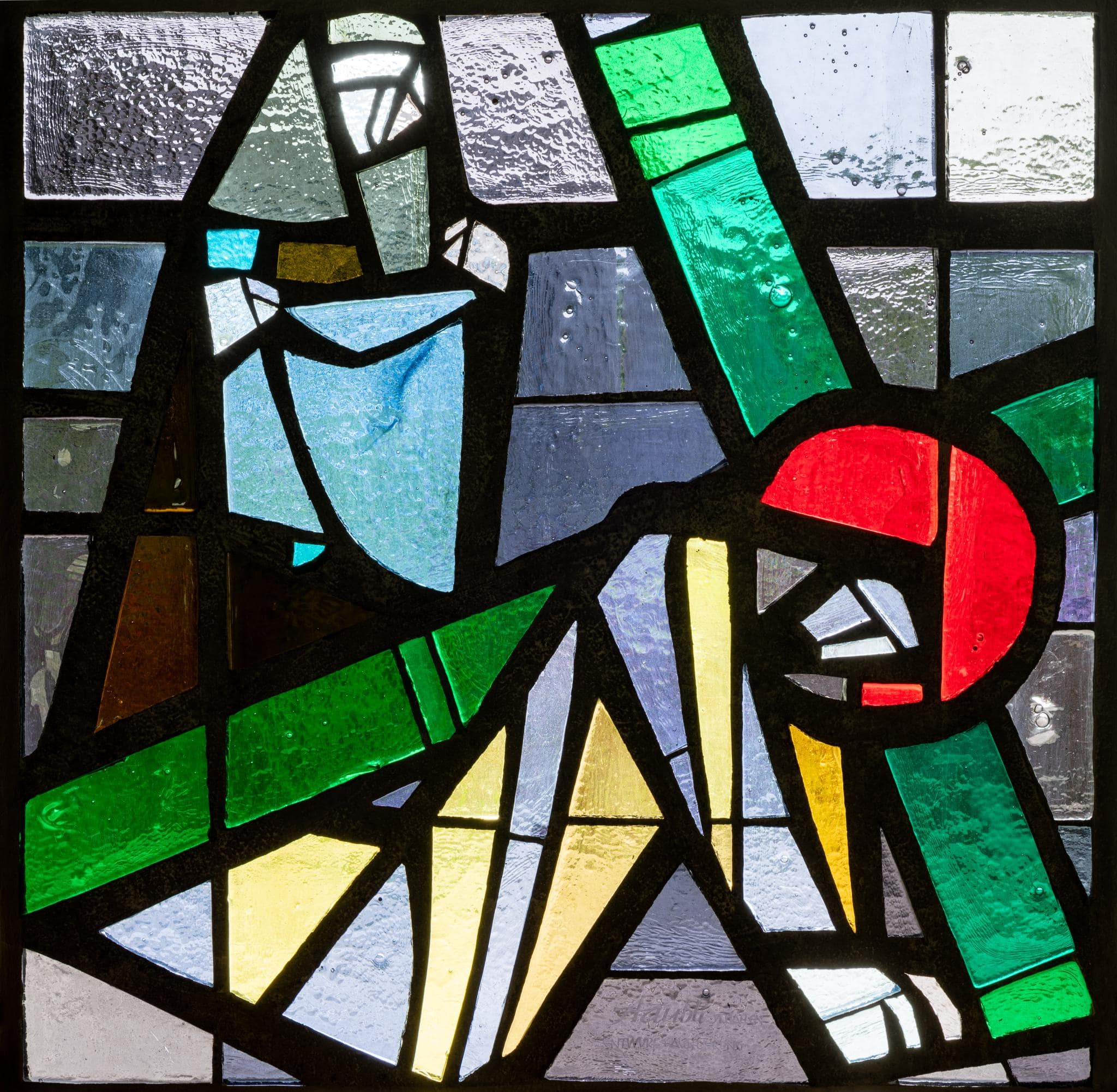 Quadratische Glasmalerei. Christus bricht zum zweiten Mal unter dem Kreuz zusammen. Veronika reicht ihm das Schweisstuch.
