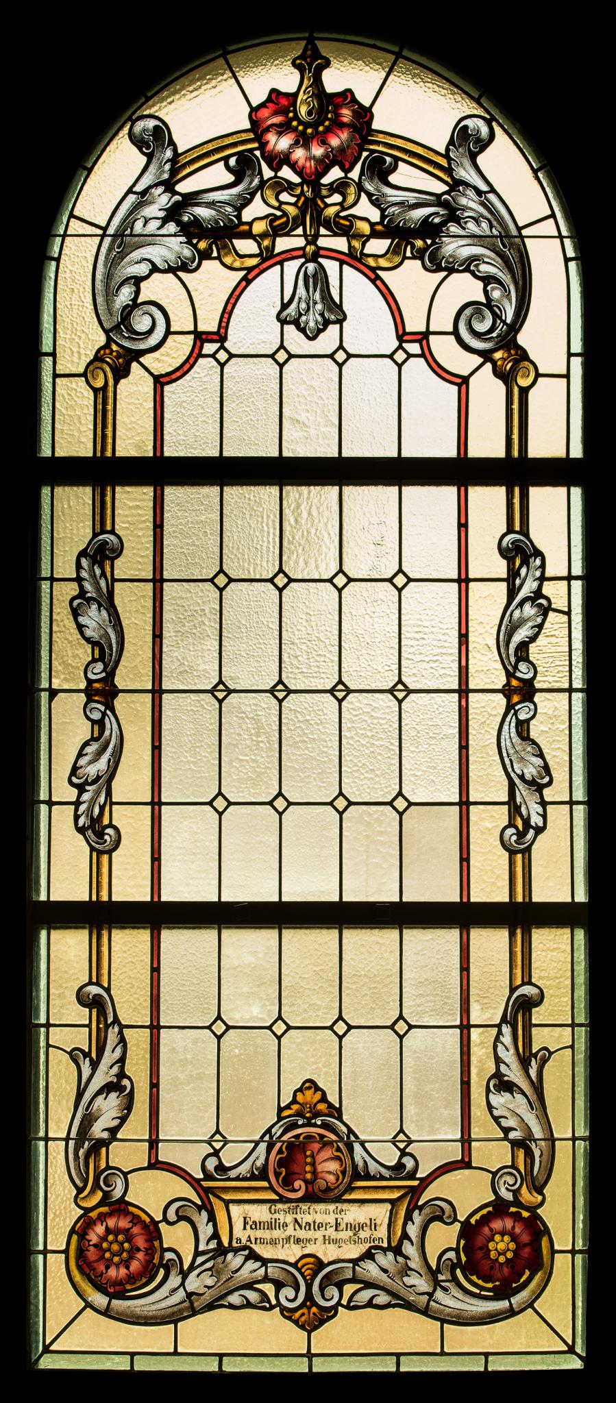 Rundbogenfenster mit einer breiten Rahmenbordüre aus Rocaillen, Blatt- und Blütenmotiven in den Farben Blau, Gelb, Rot und Lila. Die helle Fensterfläche ist durch dünne Bleistege in stehende Rechtecke geteilt. Im Sockelbereich Kartusche mit Stifterinschrift.
