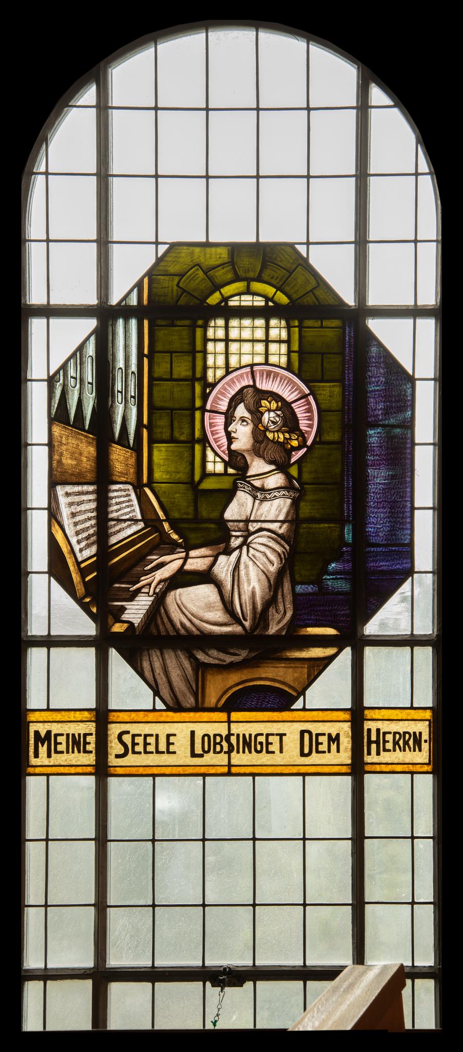 Ende 1922 präsentierte Paul Lütz der Baukommission sechs Skizzen für die Kirchenfenster (Katholisches Kirchgemeindearchiv Steinebrunn-Egnach, B 14.1.01/1; Protokoll der Baukommission vom 15. Dez. 1922, S. 65). Die Skizzen und die in der Folge ausgearbeiteten Kartons fanden grossen Anklang, – die Entwürfe stammten von einem Mitarbeiter der Firma Lütz & Elmpt, der “unter den zeitgenössischen Vertretern der Christlichen Kunst mit an erster Stelle steht” –, nicht gutgeheissen wurden jedoch Darstellungen wenig bekleideter und nackter Frauenfiguren (Katholisches Kirchgemeindearchiv Steinebrunn-Egnach, B 17.2.04/4; Briefwechsel zwischen der Baukommission und Lütz & Elmpt, März 1923).