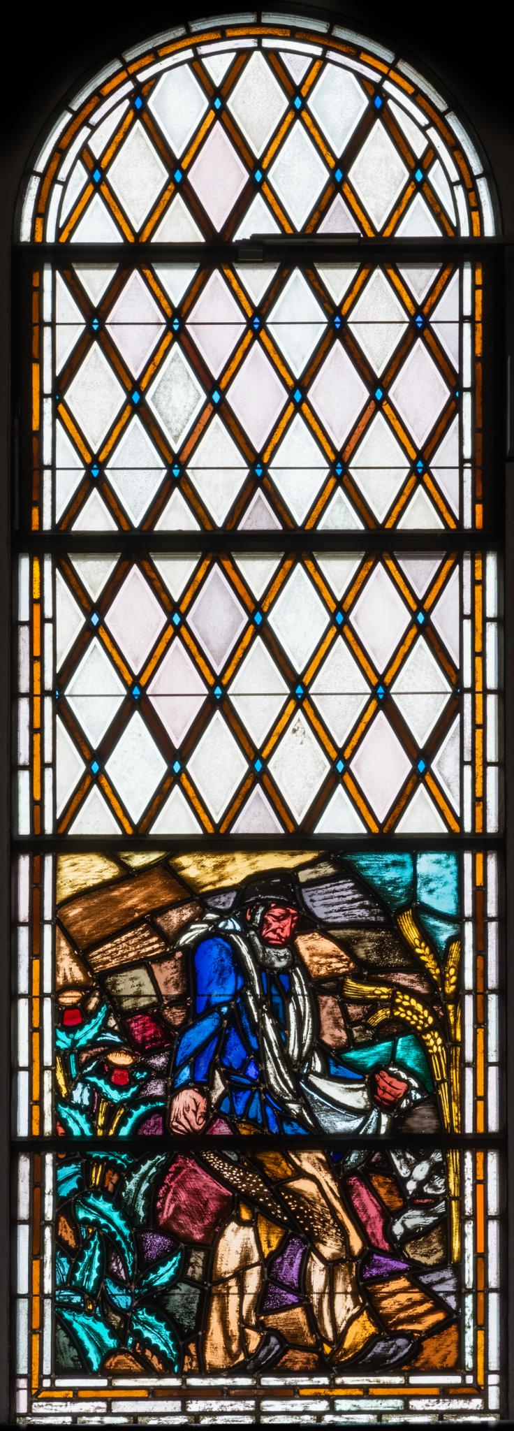 Fünfteiliges Rundbogenfenster mit schmalem, braunen Rand. In den unteren beiden Feldern ist die Szene mit dem Sämann dargestellt, der das Korn auf dem Feld verteilt. Vögel, Distel und Ähren verdeutlichen, dass nur ein Teil der Samen Frucht bringen wird. Übrige Fensterfläche mit leicht getönter Rautenverglasung gestaltet. Die Rauten werden aus braunen Glasstäben gebildet, deren Schnittpunkte blau sind.