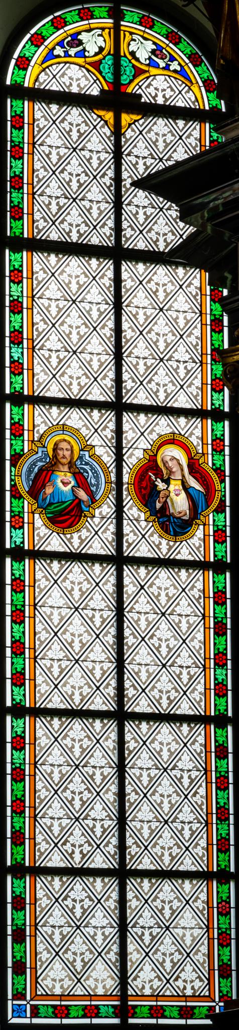 Rundbogenfenster mit Rautendamastmuster in Grisaille. Bogenfeld mit Blattornament und Blüten in Blau, Grün, Gelb und Rot gestaltet, Rahmenverzierung mit Blättern und Blüten in Grün und Rot. Im vierten Register zwei Vierpass-Kartuschen, links mit Herz-Jesu-, rechts mit Herz-Marien-Darstellung (Brustbilder). Christus hat die eine Hand im Segensgestus erhoben, mit der anderen deutet er auf sein brennendes Herz. Maria hält eine Lilie in den Händen.