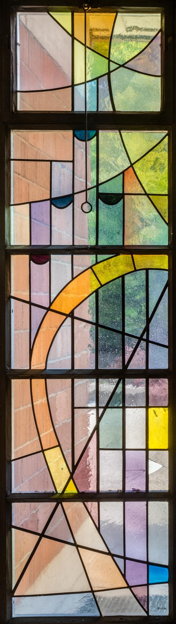 Das hochrechteckige Fenster in Brauntönen zeigt eine Harfe und Orgelpfeifen.