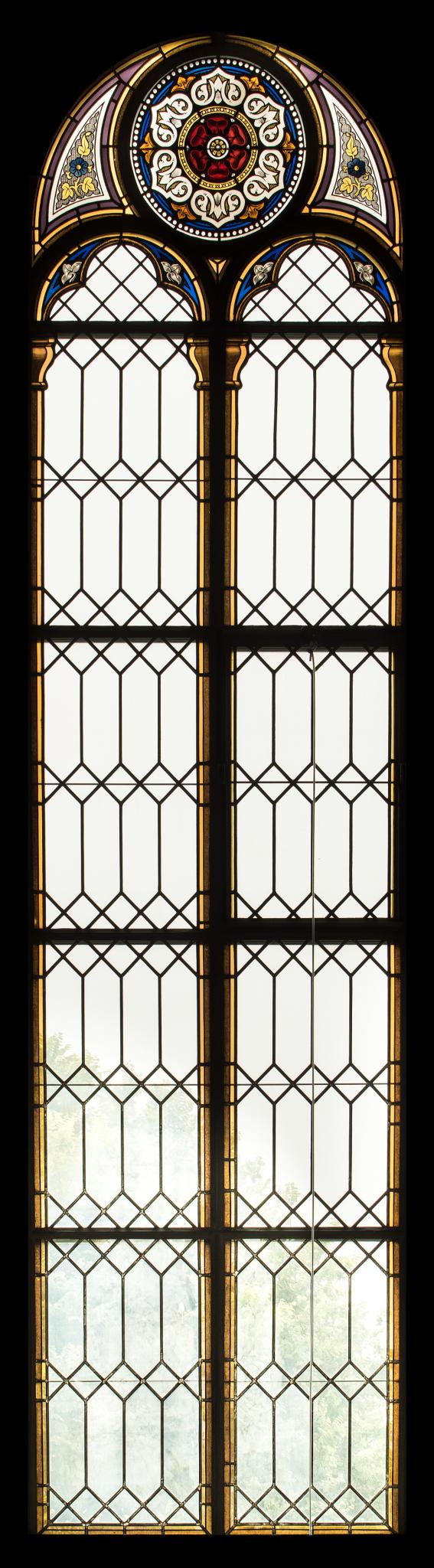 Langgezogenes Rundbogenfenster mit zwei Fensterbahnen und Bogenfeld mit Medaillon. Die beiden Fensterbahnen zeigen Arkadenrahmungen in Gelb und Rot sowie eine Blankverglasung in Schweizerrauten. Das Medaillon und die Zwickel im Bogenfeld sind mit Ornamenten verziert.