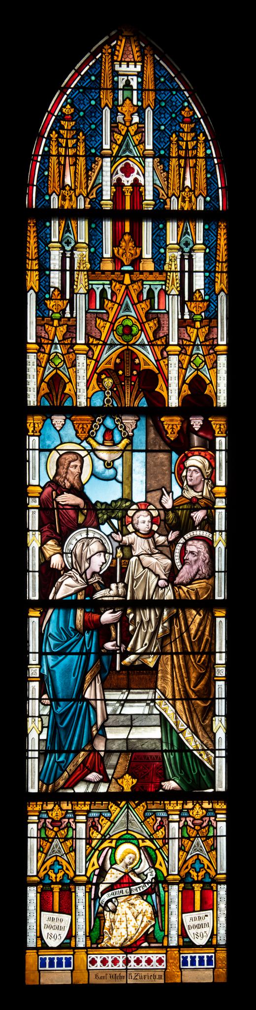 Die Chorfenster zeigen (von links beginnend): Maria Immaculata und Mariae Geburt, die Darbringung Marias im Tempel, die Verkündigung, die Heimsuchung, Geburt Christi, Jesus im Tempel, Flucht nach Ägypten, der zwölfjährige Jesus im Tempel, die Hochzeit von Kana. Entsprechend dem Stil der Architektur der Kirche, wählte Wehrli eine neugotische Formensprache für die Glasmalereien.