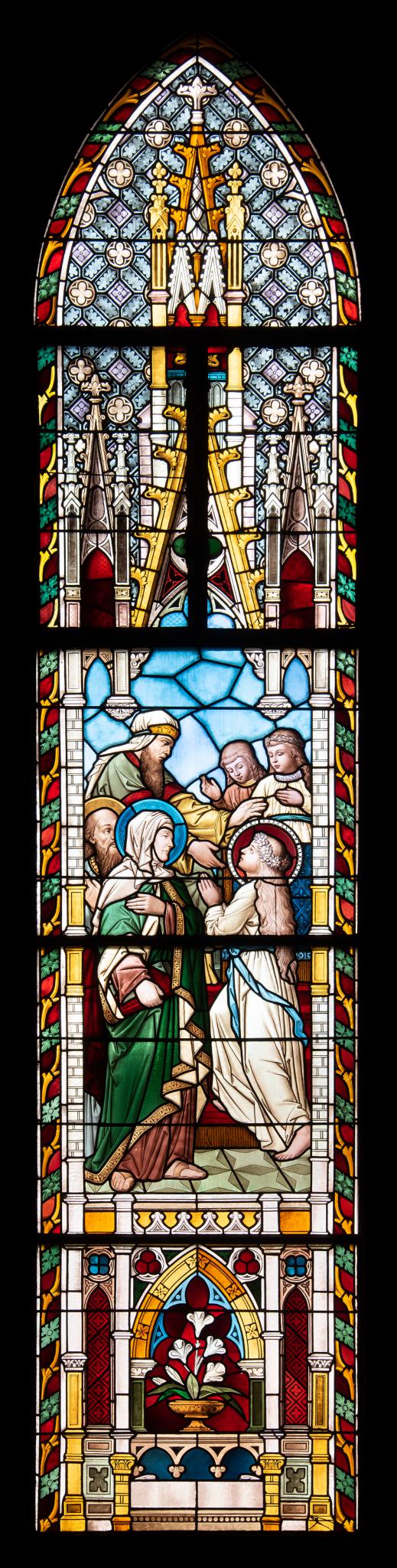 Spitzbogenfenster im neugotischen Stil. In der Mitte des Fensters tritt Maria im Tempel dem Priester entgegen. Vor ihr stehen ihre Eltern, Anna und Joachim. Im Hintergrund sind die Töchter der Hebräer, die Maria in den Tempel begleiteten, zu sehen (Protoevangelium des Jakobus). Zwei rahmende, schmale Pfeiler stützen die aus Wimpergen und Fialen gebildete Bekrönung. Der Sockelteil zeigt eine Schale mit weissen Lilien.