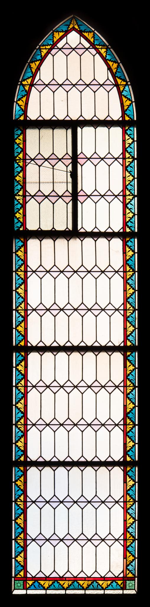 Spitzbogenfenster mit Schweizerrauten und farbiger Rahmung aus roten Rosetten und grünen Blattstielen.