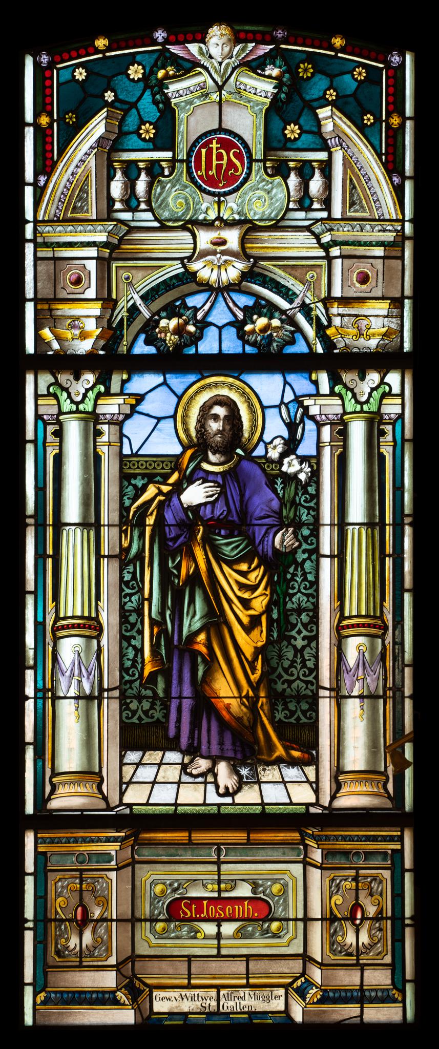 Der heilige Joseph wird mit dem Attribut der Lilie vor einem Damastvorhang unter einer barocken Portalarchitektur dargestellt. Christusmonogramm im Sprenggiebel oberhalb des Schlusssteins. Im Sockel Inschrift.