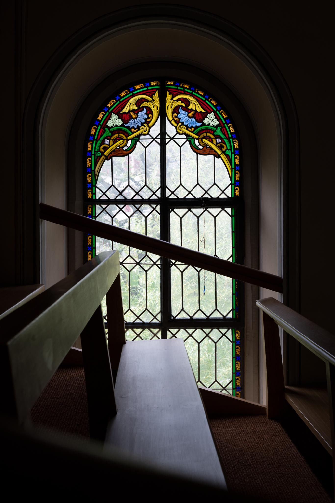Die acht grossen Fenster des Kirchenschiffs zeigen die gleiche ornamentale Gestaltung in zwei Farbvarianten. Davon unterscheiden sich die beiden kleineren Fenster über den Seiteneingängen und das Chorfenster.