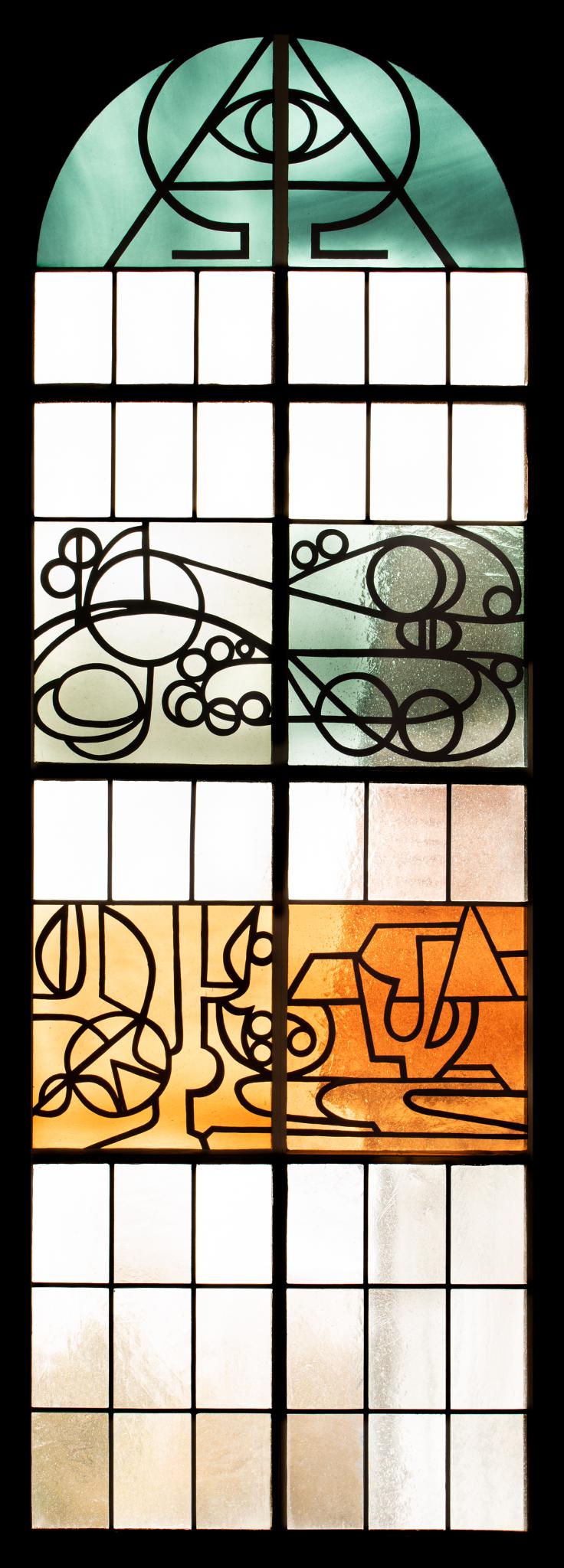 Im Bogenfeld dieses Mittelfensters ist ausserdem das Auge Gottes zu sehen als Sinnbild für den siebten Tag der Schöpfung, an welchem Gott ruhte.