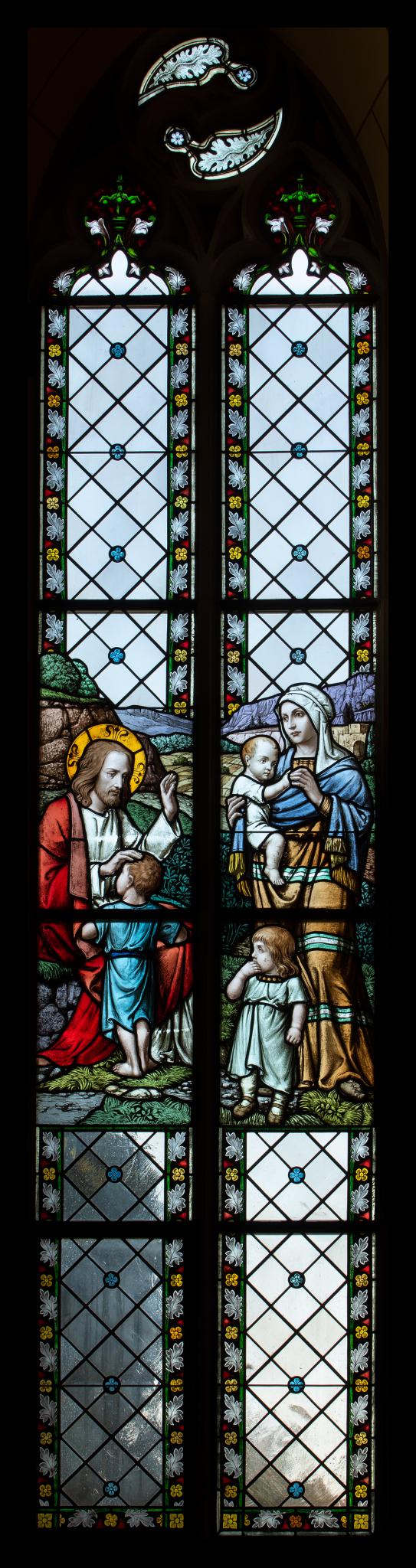 Das Kinderfreund-Fenster gehört zu einer Gruppe von sechs Schifffenstern (vier Fenster mit Szenen aus dem Leben Christi und zwei Ornamentfenster), die 1908 im Zuge einer Kirchenrenovation eingesetzt wurden. Am 11. September 1907 hatte die paritätische Baukommission beschlossen, die Kirche zu renovieren (Arch. Albert Rimli, Frauenfeld), worauf eine kontroverse Diskussion zu Nutzen und Gestaltung der neuen Schifffenster folgte (Katholisches Kirchgemeindearchiv Sommeri, B12.03.05A, Parit. Kirchenvorsteherschaft Sommeri Sitzungsprotokolle 1835-1935, S. 240, 251). Im August 1908 lagen Offerten der Firmen Kirsch und Fleckner (Freiburg), Graf (Kreuzlingen), Kuhn (Basel), Berbig (Zürich) und Zettler (München/Winterthur) für Fenster mit und ohne Figuren vor (S. 260, 263, 264). Die Kommission zog unterdessen in Betracht, kleinere Bilder in den Mittelfeldern der Fenster anbringen zu lassen, damit die Kirche nicht zu dunkel würde. Da ein Bild von Zettler gut gefiel, wurden vom Vertreter der Zweigfiliale der Königlich Bayerischen Hofglasmalerei in Winterthur, Max Meyner, neue Vorschläge erbeten. Die Auswahl der Bildszenen (Szenen aus Kindheit und Jugend Christi sowie kirchliche Feste) übertrug man den beiden Pfarrern Dutli und Wellauer. Der Vertrag mit der Königlich Bayerischen Hofglasmalerei von F.X. Zettler wurde im August 1908 abgeschlossen, die sechs Fenster für den Preis von insgesamt 3600.– Franken im Dezember 1908 nach Sommeri geliefert (Evang. Kirchgemeindearchiv Amriswil, 6.50.c Kirche Sommeri, Renovation 1908/09 (Umschlag Kirchenrenovation 1908/09): Vertrag vom 22.8.1908 und Rechnung vom 28.12.1908).