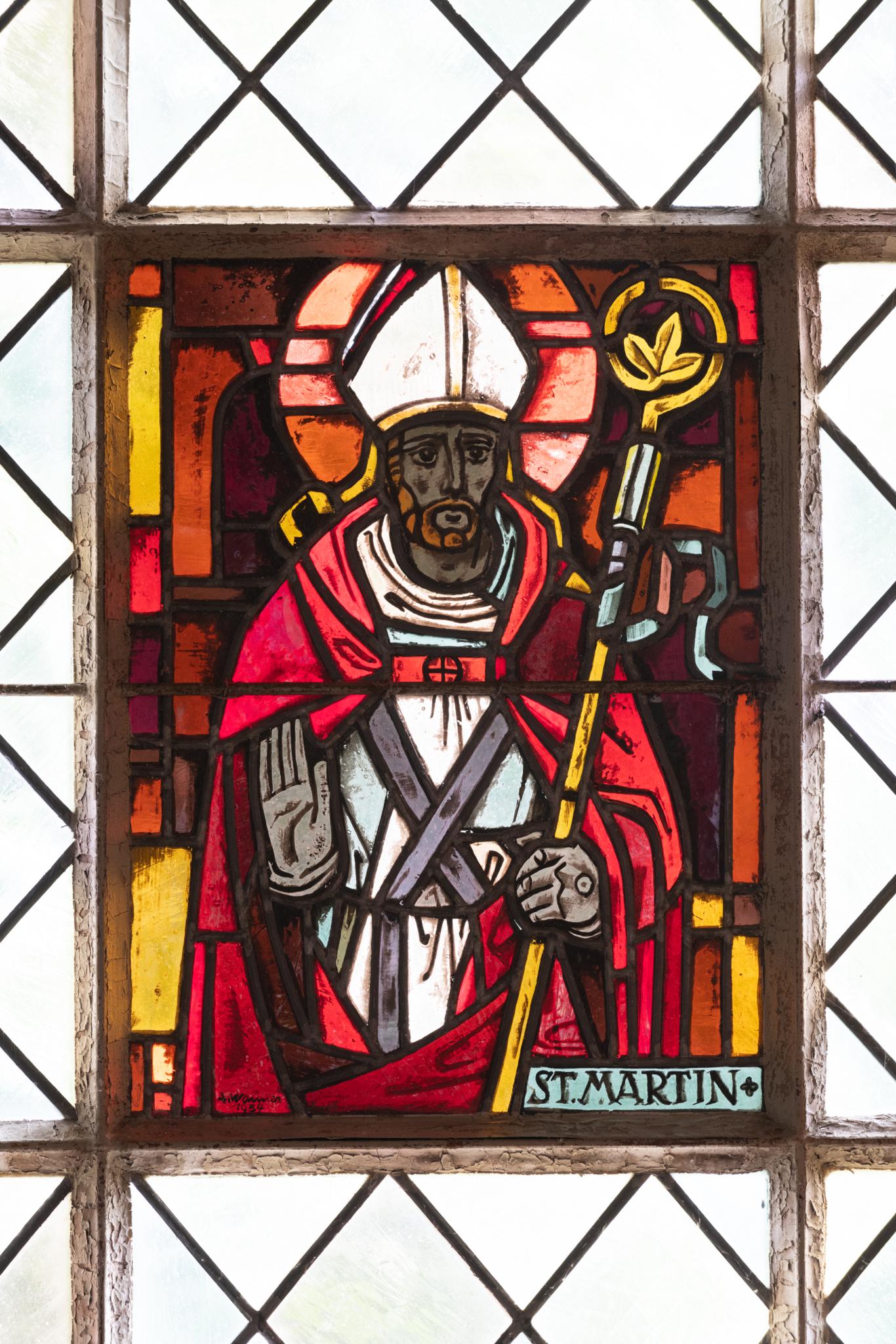 Rundbogenfenster mit blanker Rautenverglasung. Im zentralen Fensterfeld Darstellung des heiligen Martin als Bischof im roten Mantel und mit Hirtenstab.