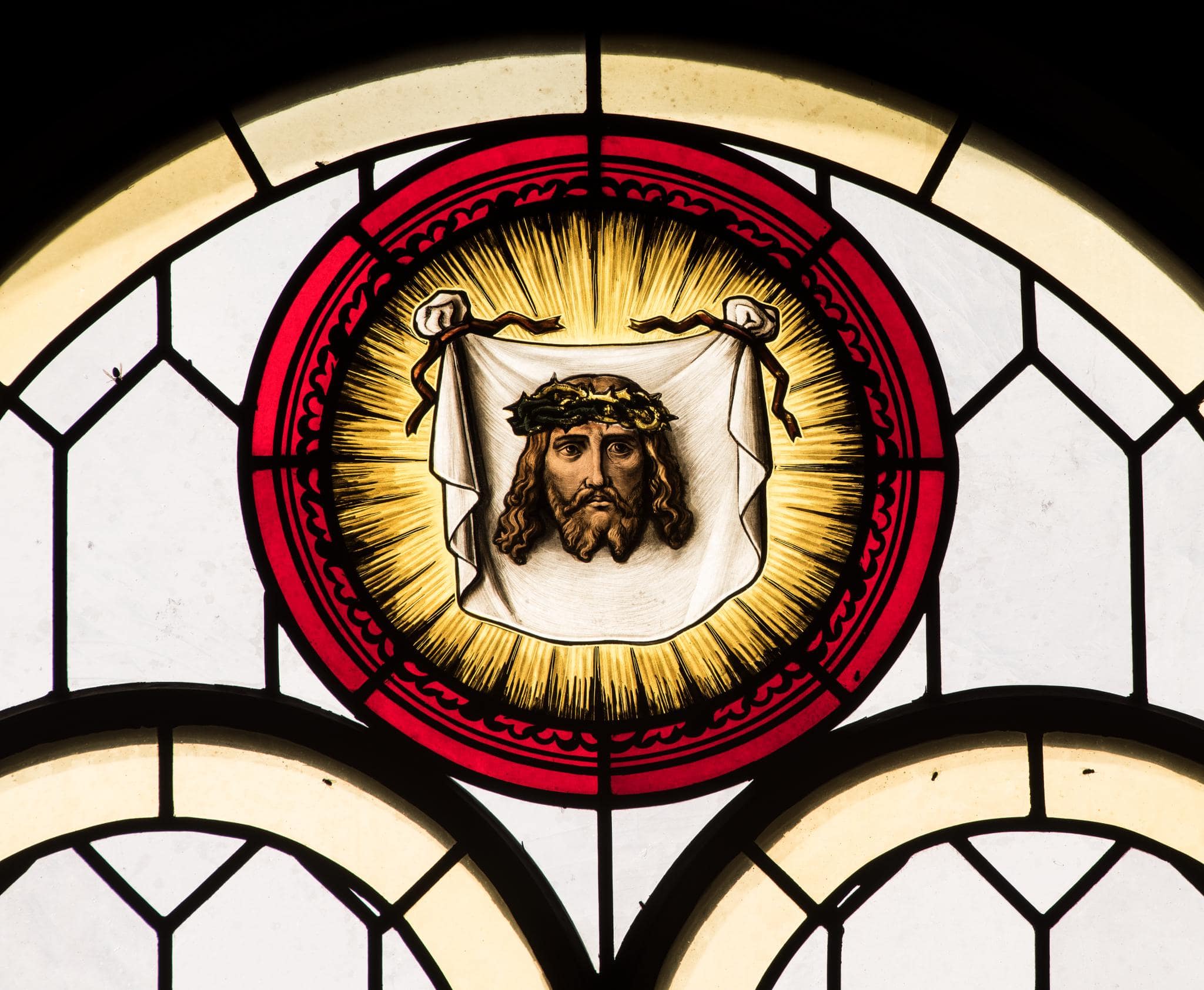 Rot gerahmtes Medaillon mit dem Schweisstuch der Veronika vor einem Strahlenkranz im Bogenfeld eines Rundbogenfensters mit Blankverglasung (Schweizerrauten) und gelbem Rand.