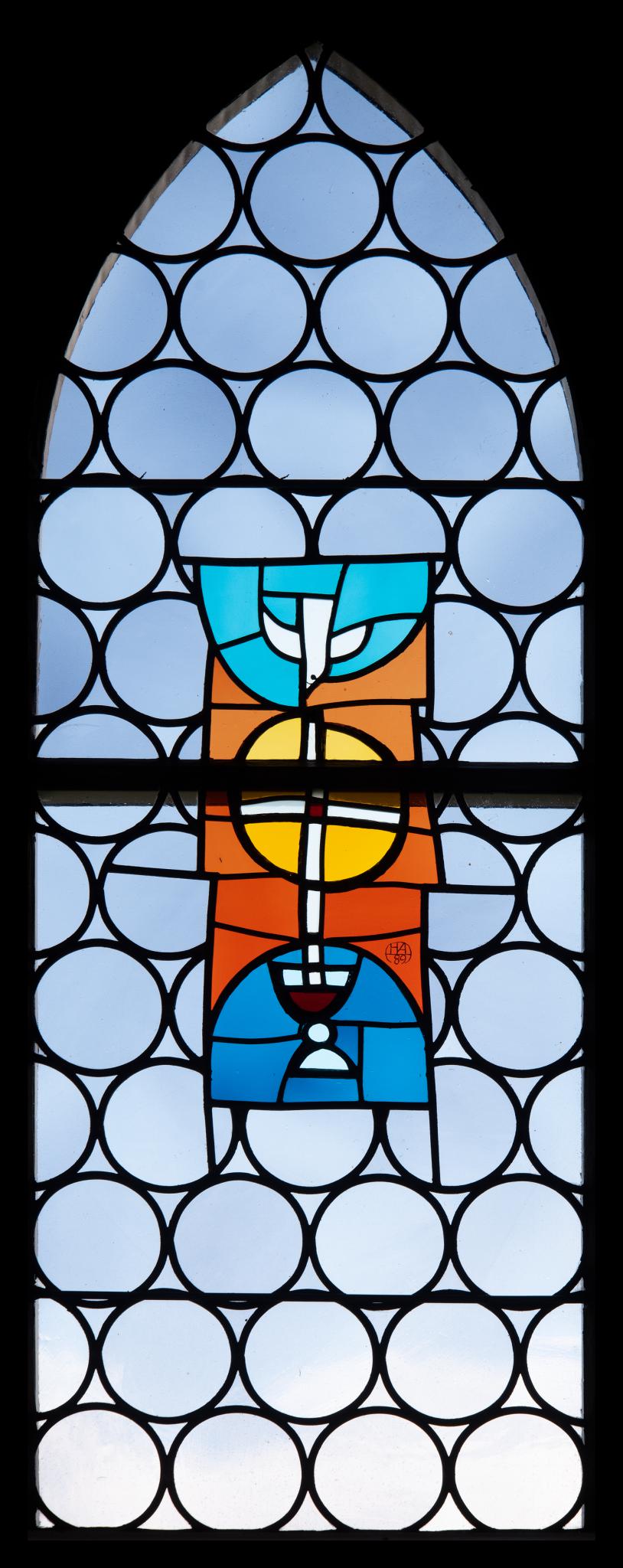 Spitzbogenfenster mit Butzenverglasung und zentraler figürlicher Darstellung. Vor einem blauen Halbkreis steht ein Kelch, darüber schwebt ein Brotlaib mit eingeschnittenem Kreuz, zuoberst schwebt der Heilige Geist als Taube.