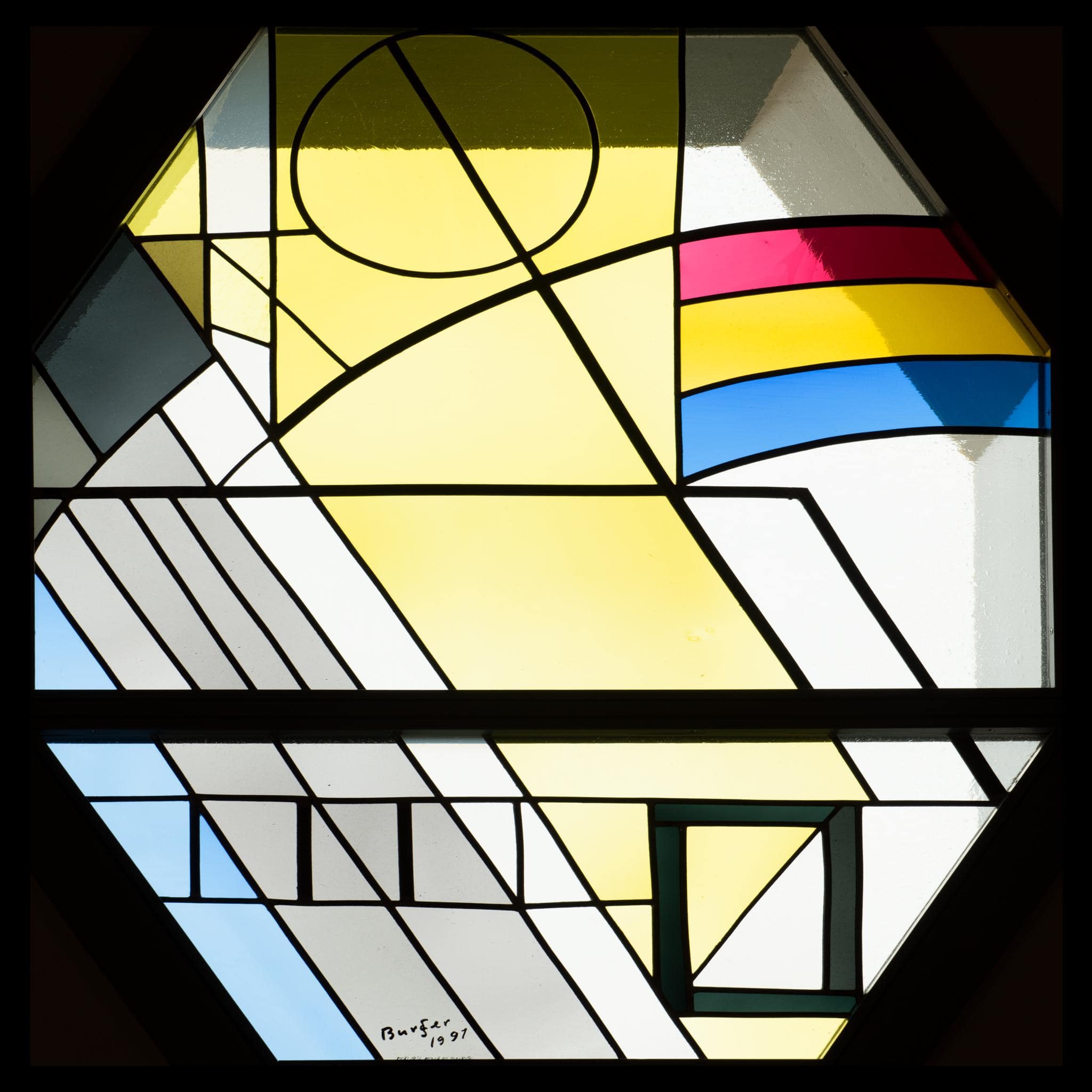 Oktogonales Fenster mit einer abstrakten Darstellung, rechts ein Regenbogen.
