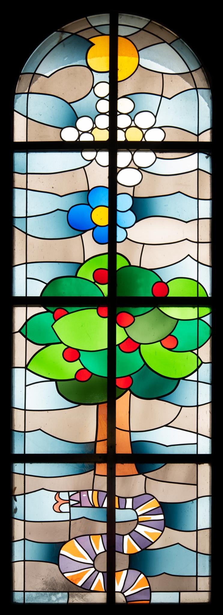 In der Mitte des Rundbogenfensters steht der Baum der Erkenntnis mit roten Früchten, darunter erscheint die Schlange.
