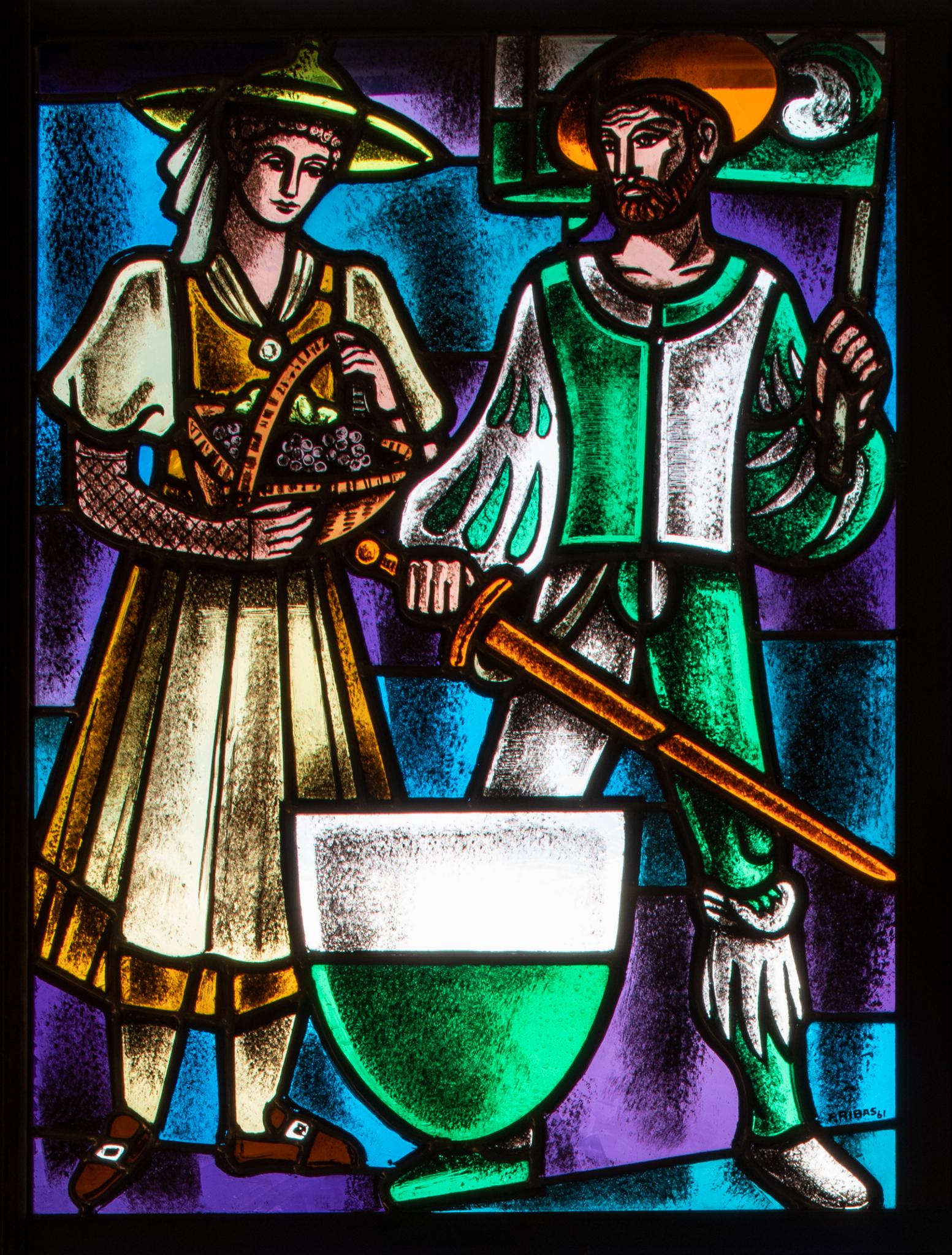 Eine Frau mit Traubenkorb und ein Bannerträger mit Schwert fungieren als Schildhalter des Wappens der Waadt.