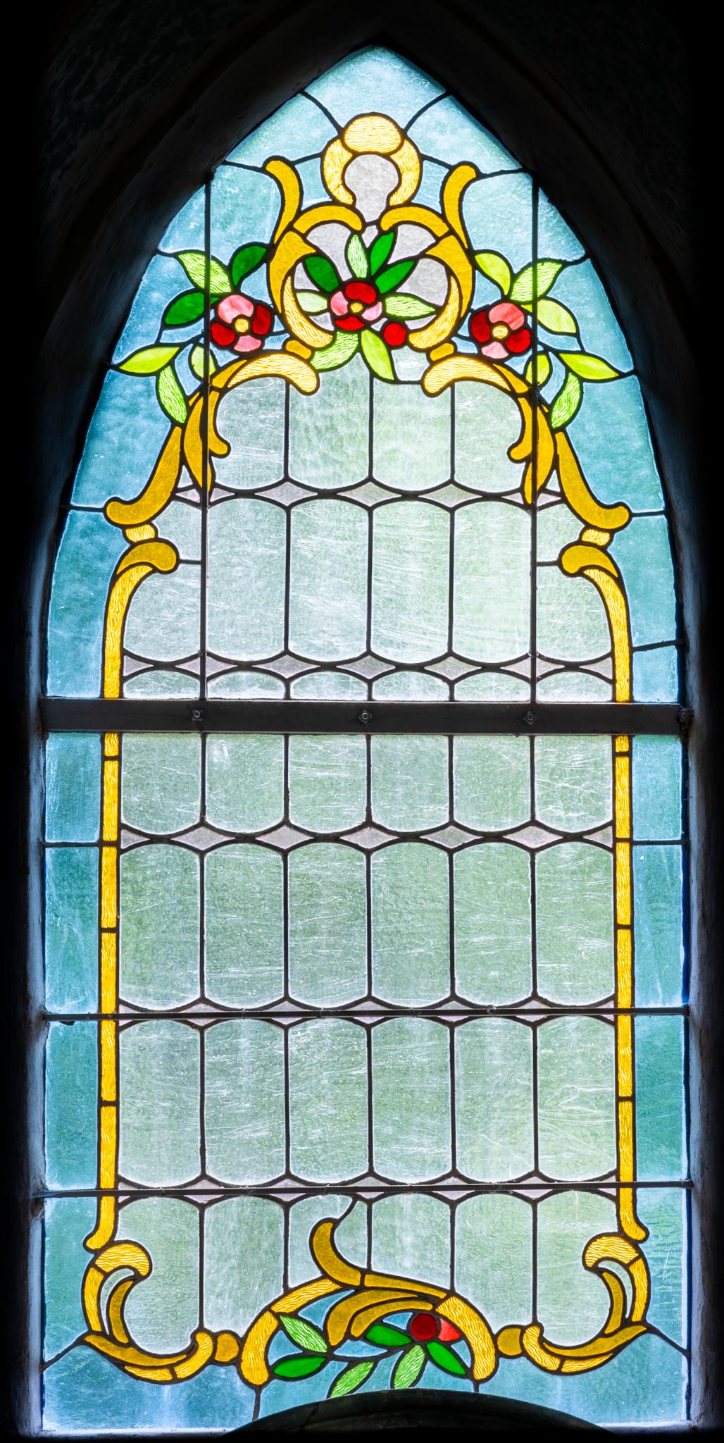 Zweiteiliges Spitzbogenfenster mit gelber Rahmung aus stilisierten Rocaillen mit floralem Ornament im Bogenfeld. Bordüre aus hellblau getöntem Glas, Fensterfläche aus weissem Glas (abgerundete Rauten, zudem kleine Spickel aus lila gefärbtem Glas).