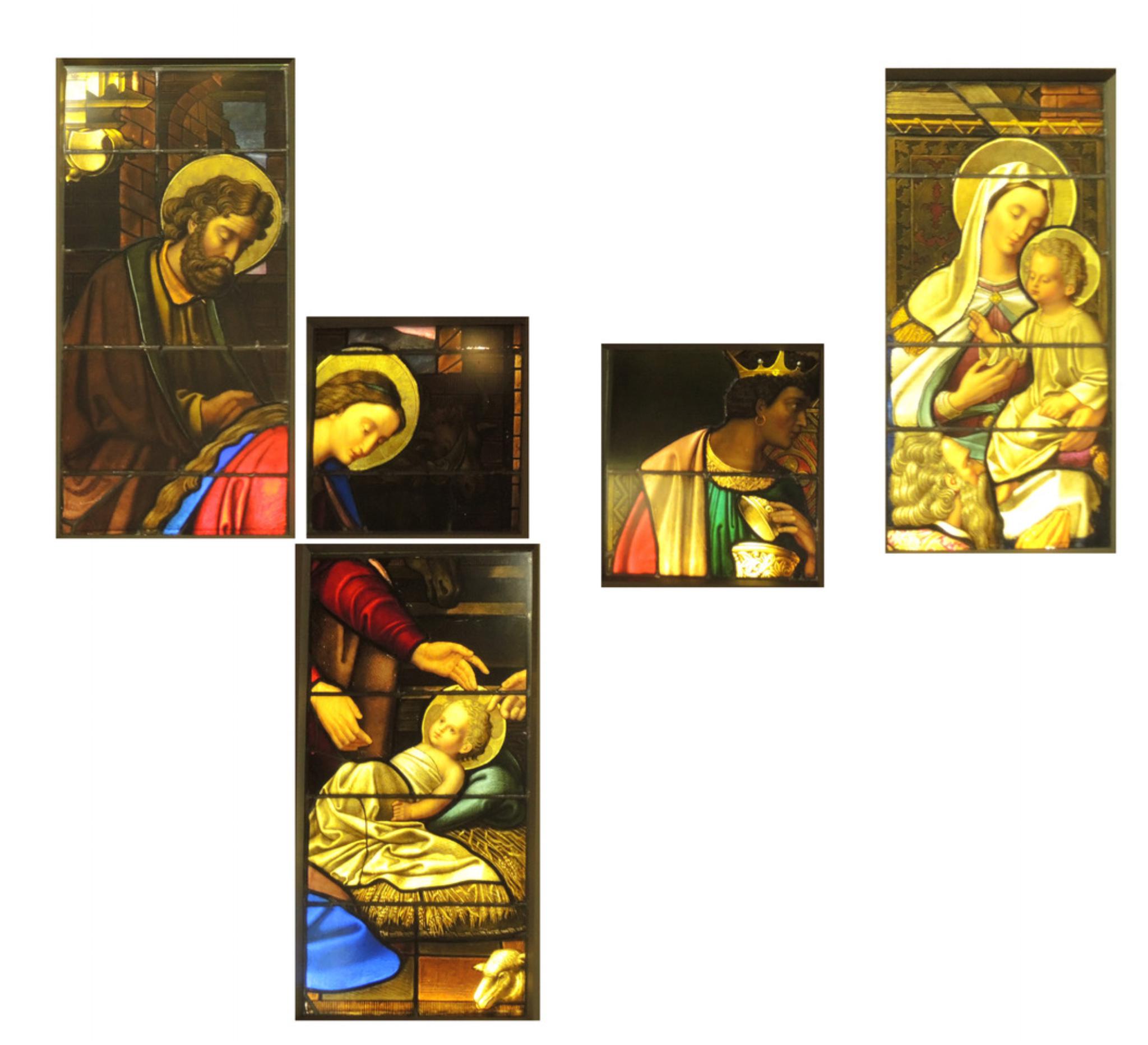 Es handelt sich um fünf Fragmente der ehemaligen beiden Chorfenster der St. Martinskirche in Arbon. Es lassen sich zwei biblische Darstellungen rekonstruieren. In der Szene der Anbetung der Hirten beugt sich Maria im roten Gewand zum im Stroh liegenden Christuskind hinab. Hinter ihr steht Joseph mit verschränkten Händen. Rechts neben der Krippe ist ein Schafskopf zu erblicken, der auf die Hirten schliessen lässt. In der Szene der Anbetung der Heiligen Drei Könige erscheint Maria, wiederum in einem roten Gewand, mit dem Jesuskind auf ihrem Schoss. Vor ihnen kniet Melchior, auf einem zweiten Fragment ist Balthasar zu sehen.