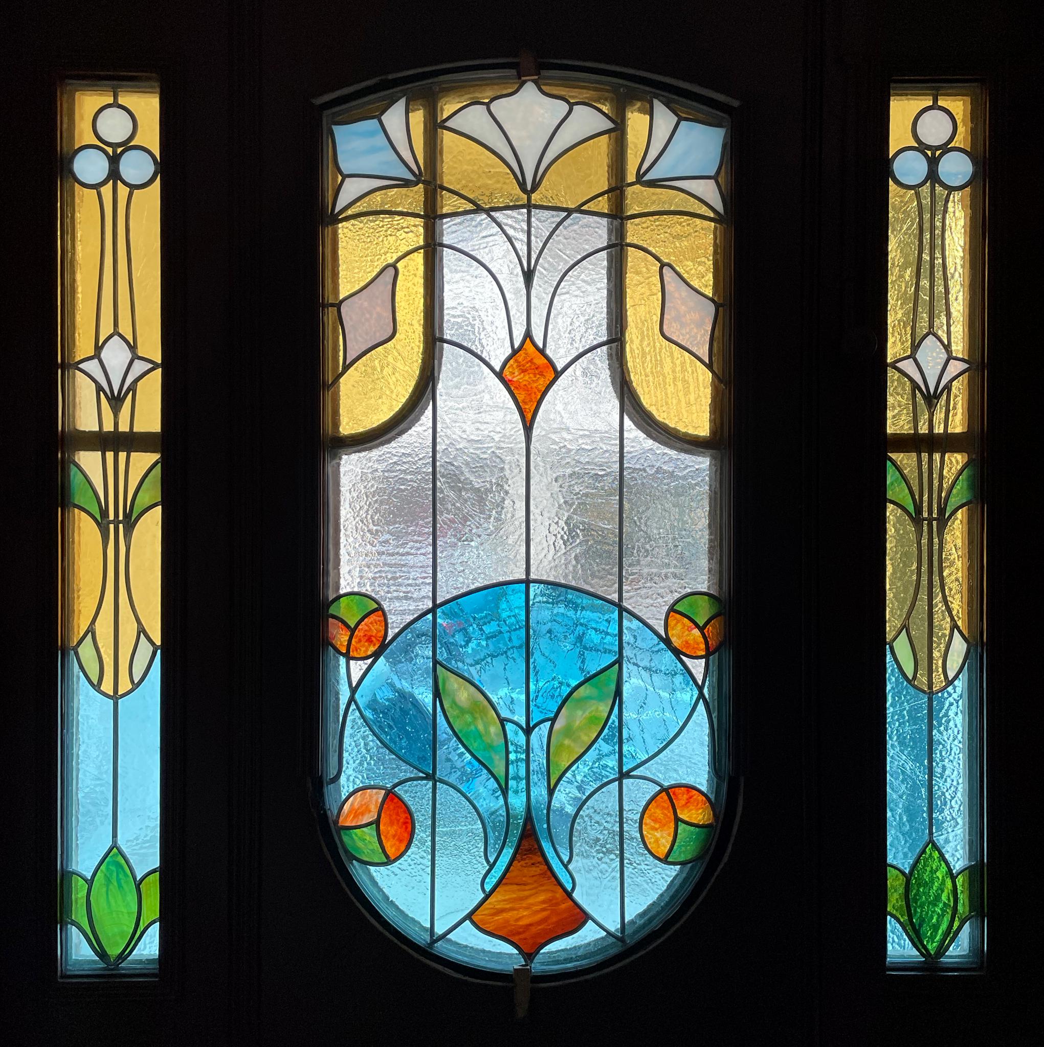 Dreiteilige Türverglasung mit stilisierten Blumen im Jugendstil.