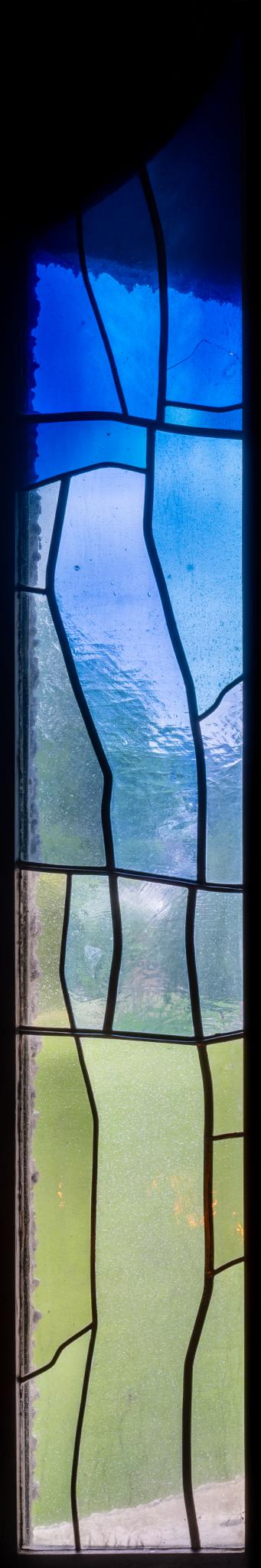 Hochrechteckige, aus unregelmässigen Vierecken gebildete Glasmalerei, unten in farblosem Glas, gegen oben hin in Blautönen.