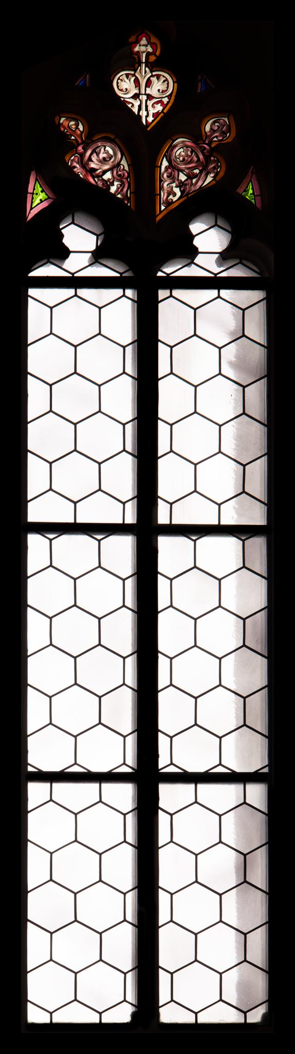 Zweilanzettiges Masswerkfenster mit blanker Wabenverglasung, das Masswerk – Fischblasen und Eckspickel – mit farbigen Krabben- und Blattornamenten geschmückt.