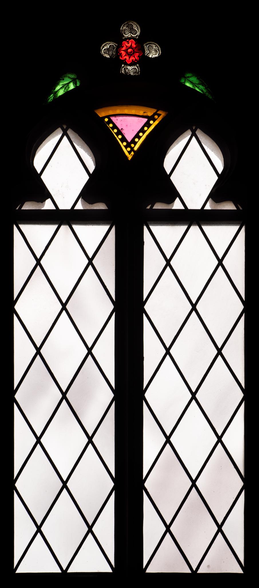 Zweilanzettiges Masswerkfenster mit blanker Rautenverglasung, im farbig gestalteten Couronnement (Vierpass) stilisierte Blume und gemalte Dreipass-Masswerke. Identisch mit gegenüberliegendem Fenster S VI.