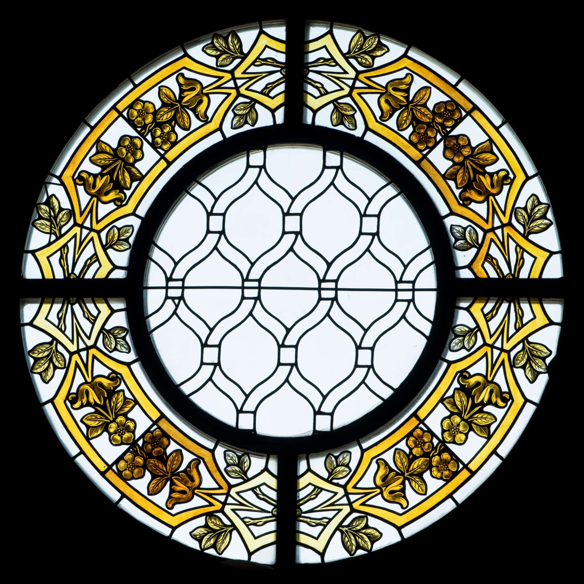 Rundfenster mit breitem, vegetabilem Rahmen in Grisaille und Gelb, ansonsten blank verglast.