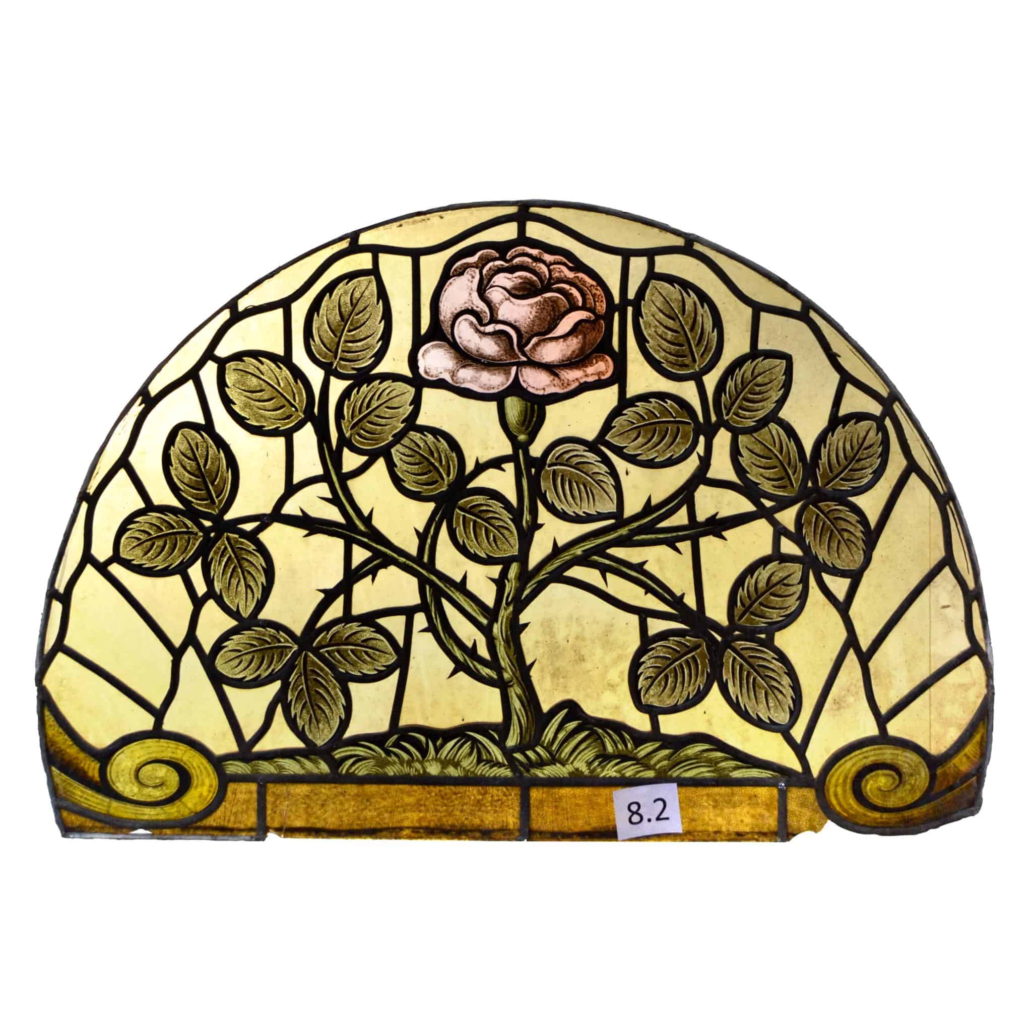Fragment einer nierenförmigen Fensterverglasung, in deren Zentrum ein Rosenstrauch mit einer Blüte dargestellt war. Ein breiter Schmuckrahmen umfasste ursprünglich das ansonsten wohl blank verglaste Fenster. Erhalten ist einzig das Feld mit dem christlichen Symbol.
