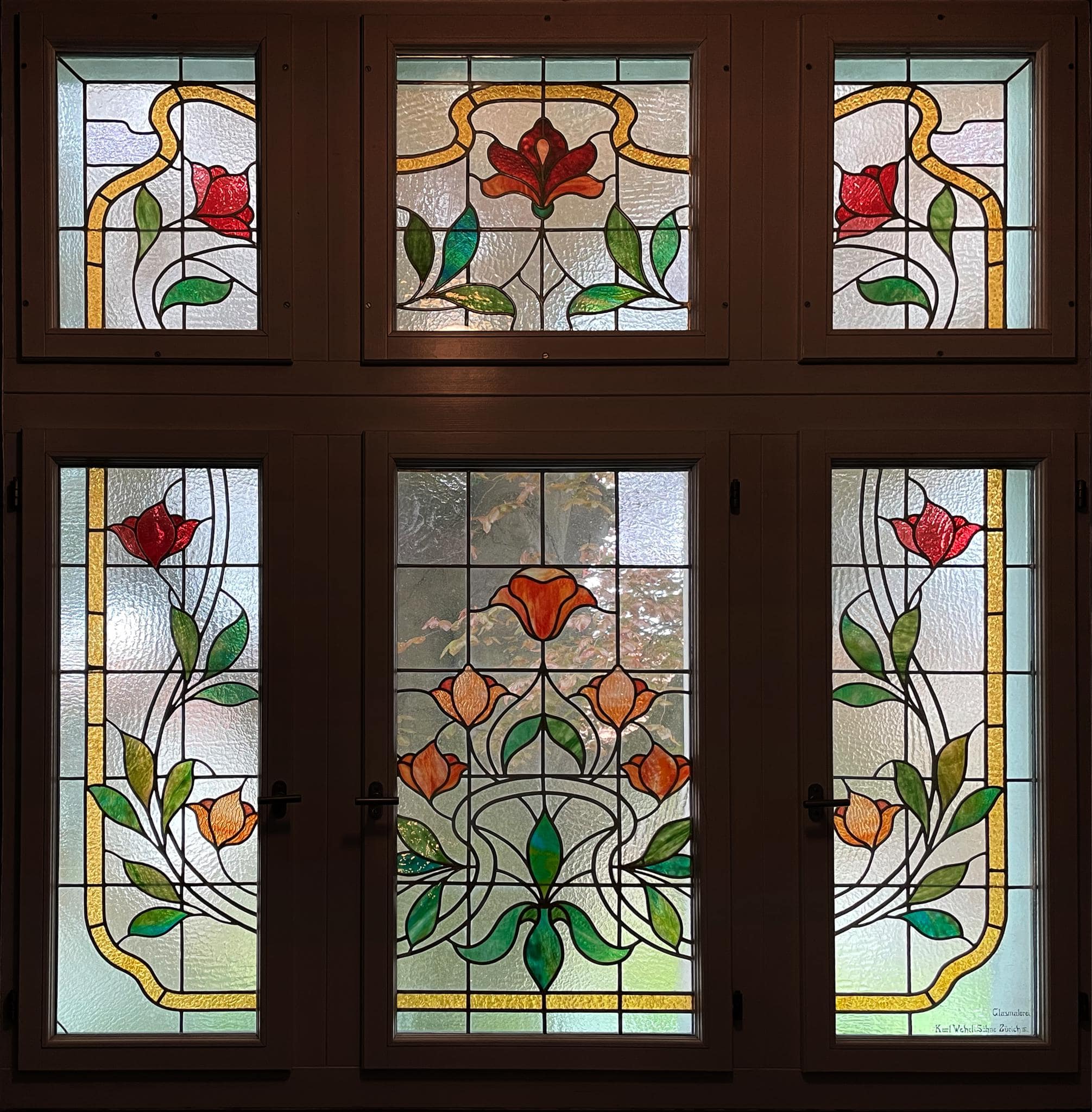 Sechsteiliges quadratisches Fenster mit stilisierten roten Blumen im Jugendstil. Anstelle von weissem Kathedralglas wurde in der Fenstermitte Flachglas verwendet, das den Blick nach aussen freigibt.