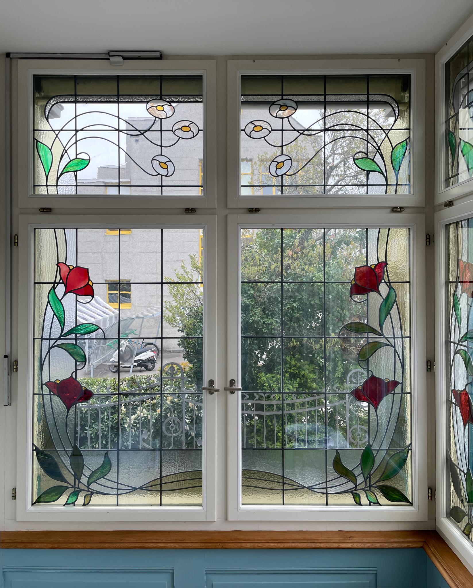 Vierteiliges rechteckiges Fenster mit stilisierten roten und weissen Blumen im Jugendstil. Teil einer Verandaverglasung aus insgesamt vier Fenstern.