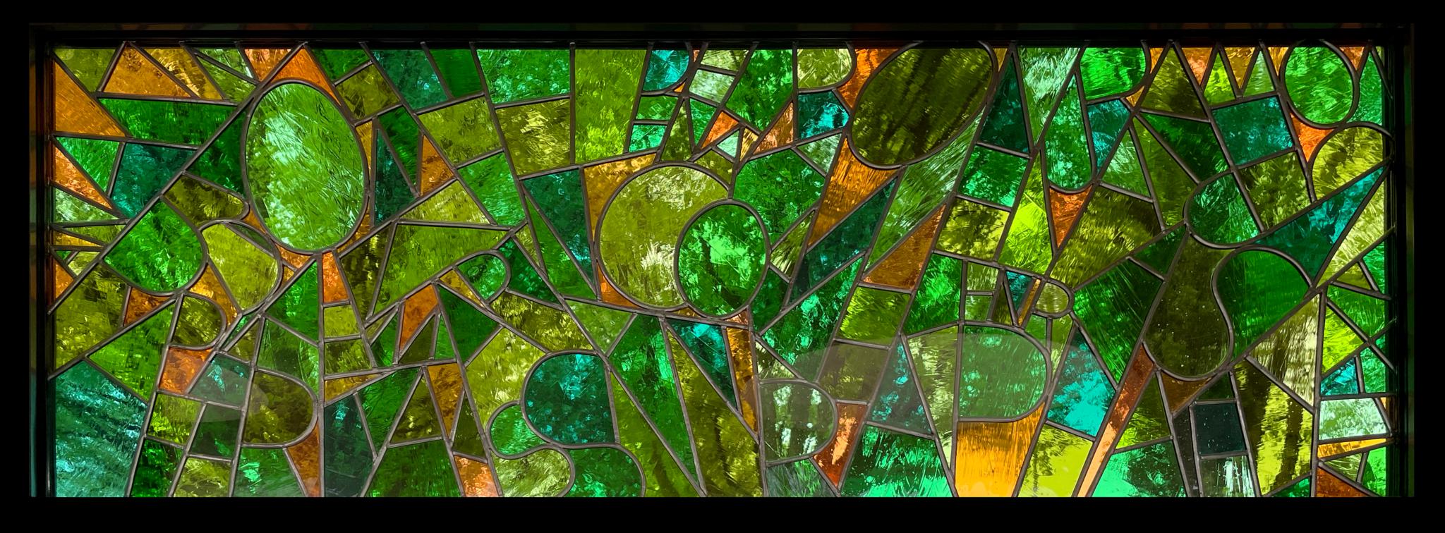 Rechteckiges Glasgemälde mit Ornament aus Buchstaben. Grundfarbe Grün.