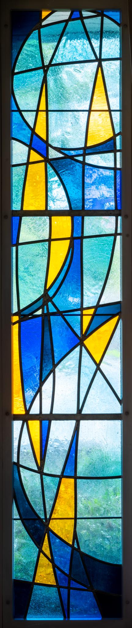 Hochrechteckfenster mit abstrakt-geometrischer Glasmalerei. Dominierende Blautöne.