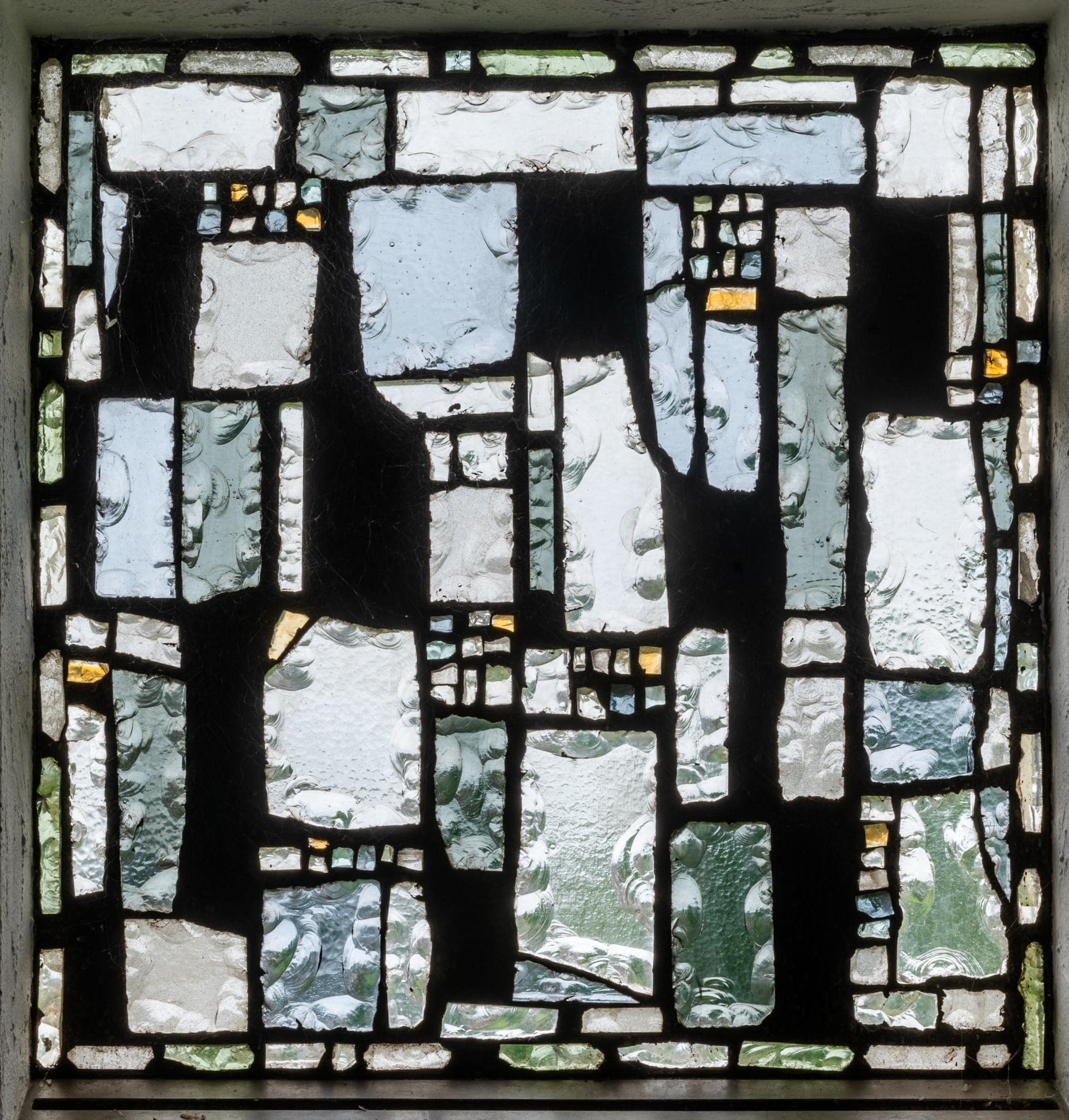 Betonverglasung mit grossen, rechteckigen grünlichen und bläulichen Gläsern, Flächen mit kleineren, u.a. gelben Farbgläsern sowie dunklen Betonflächen. Eines von fünf gleichen Fenstern.