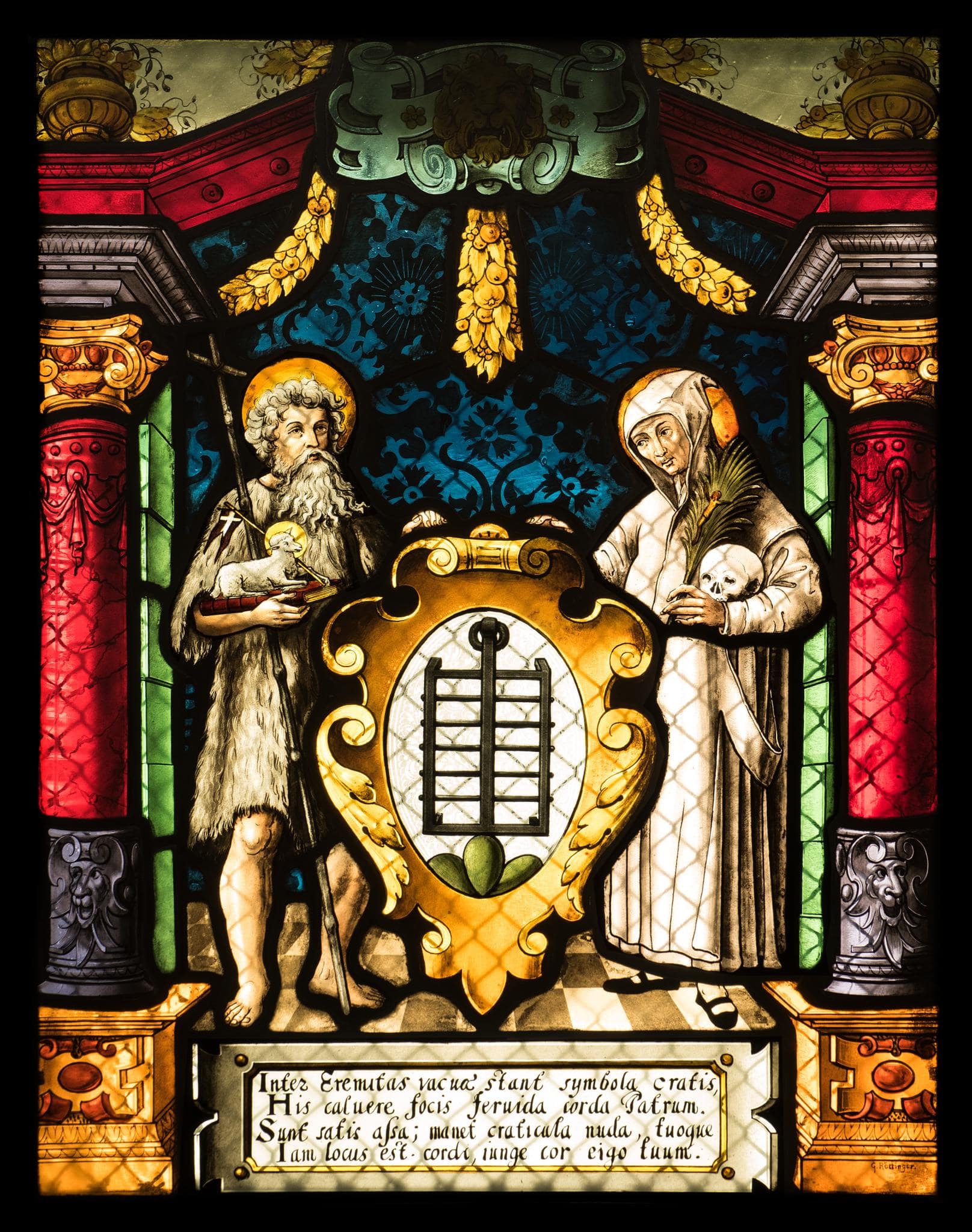 Vor blauem Damastgrund stehen Johannes der Täufer und der hl. Bruno als Schildhalter des Wappens des Klosters Ittingen. Rahmende Säulen tragen einen Flachbogen, dessen Scheitelkartusche eine Löwenmaske trägt. Am Scheibenfuss befindet sich ein Spruch.
