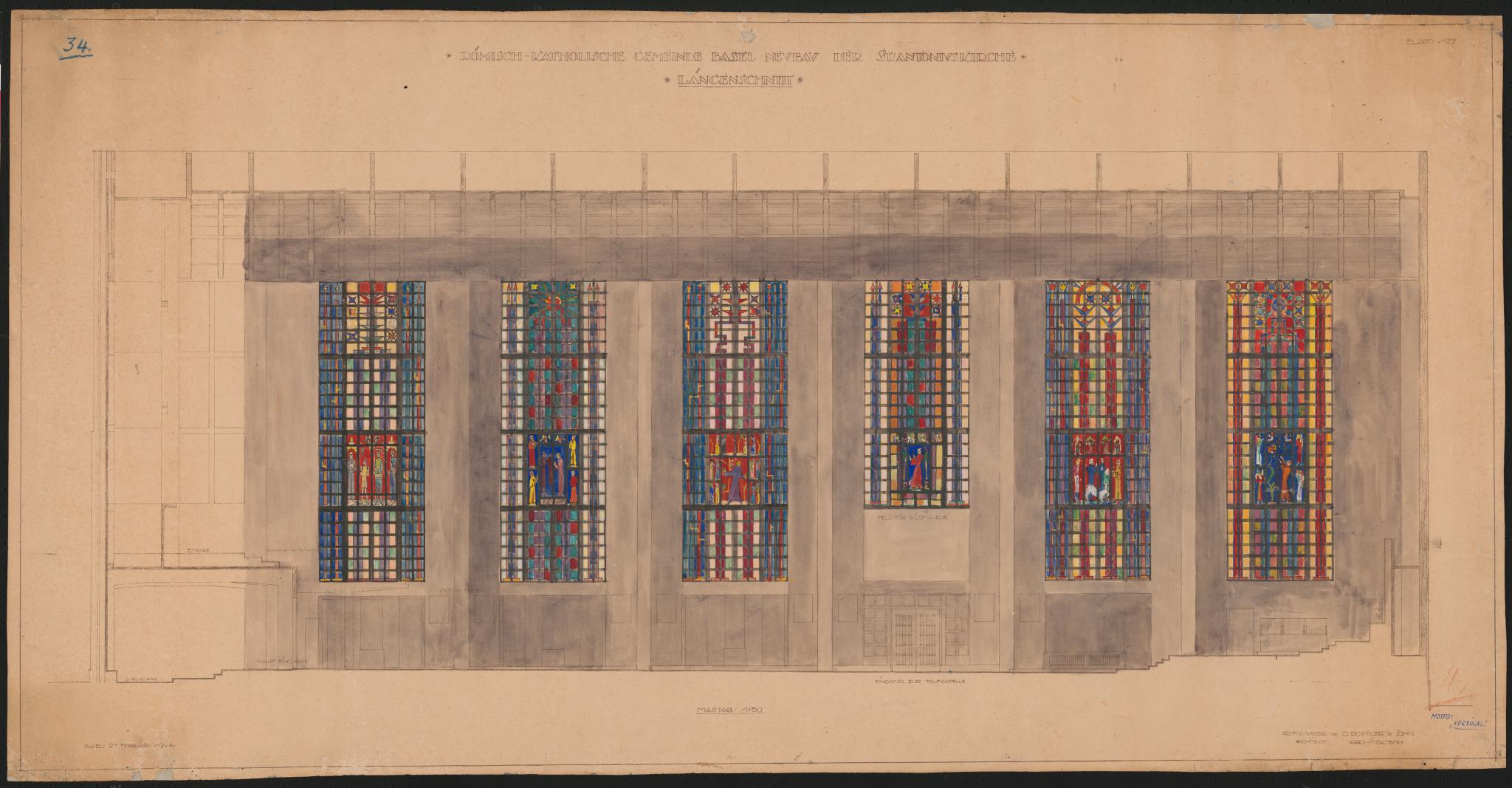 Der Entwurf zeigt einen Längsschnitt der St. Antoniuskirche in Basel, dargestellt ist die Nordseite des Kirchenschiffs. Skizziert sind sechs hochformatige Fenster mit geradem Abschluss. Das dritte Fenster von rechts ist kürzer als die anderen fünf, weil sich darunter der Durchgang zur Taufkapelle befindet. Der Chorbereich der Kirche ist auf dem Entwurf rechts zu sehen. Zwischen dem ersten und dem zweiten Fenster von rechts sind die den Chor und das Hauptschiff trennenden Treppenstufen zu erkennen.