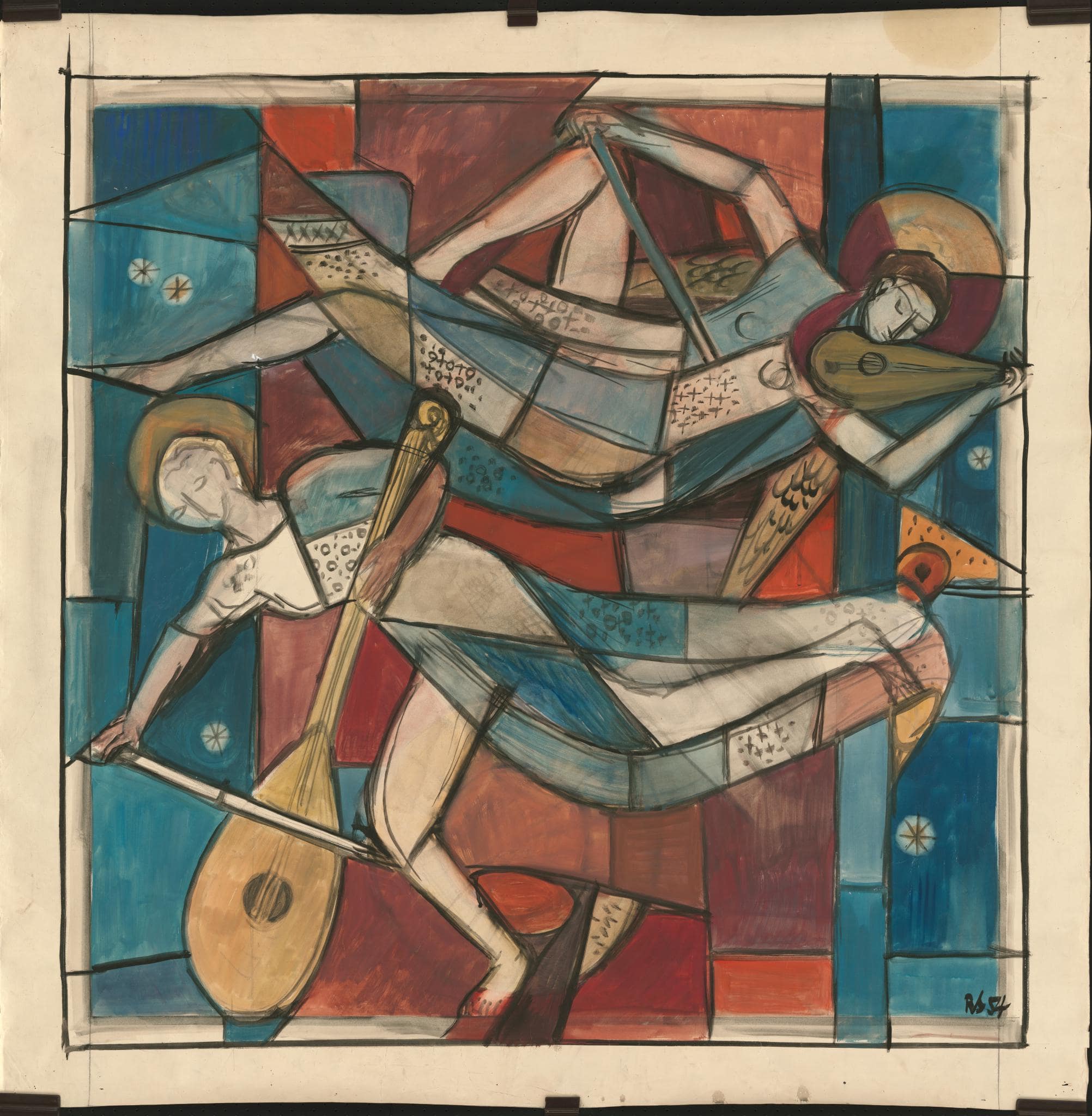 Die Figuren der Engel weisen wie die anderen beiden figürlichen Scheiben Schärs eine charakteristische Bildsprache auf, die eine eher flächenhafte Gliederung und Vereinfachung der Formen mit einem gewissen Ernst des Ausdrucks kombiniert. Die Strenge wird durch eine gewisse Leichtigkeit aufgehoben, die durch die schwebenden Engel wortwörtlich ins Bild gebracht wird. Dieser Entwurf zeigt als Hintergrund die umgekehrte Anordnung des geometrisch-abstrakten Entwurfs: in der Mitte ein breiter roter Streifen, der seitlich von zwei blauen Bereichen flankiert wird.