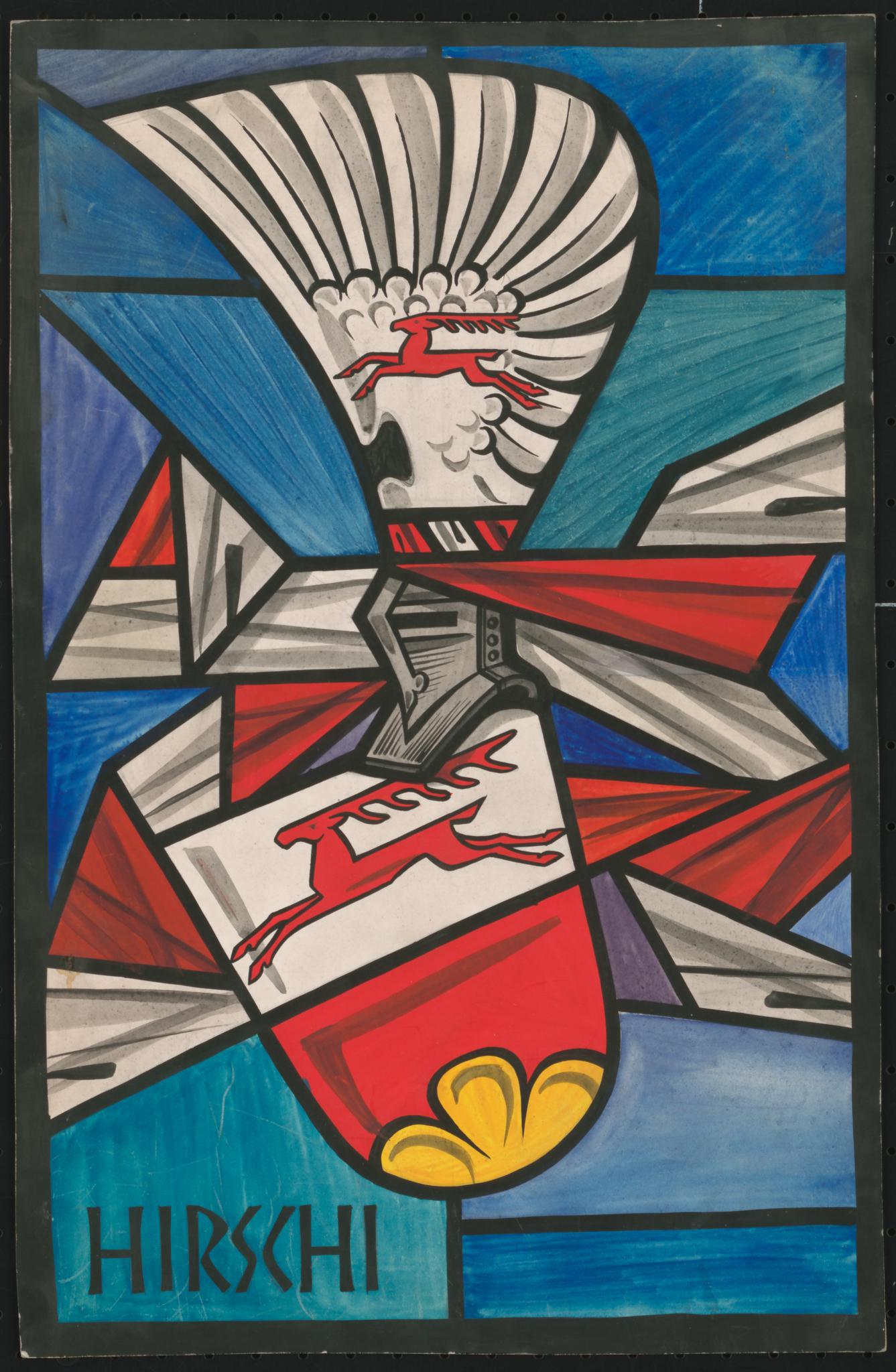 Vor blauem Grund ist das Vollwappen der Hirschi dargestellt. Die Helmdecke ist grafisch-flächig abstrahiert und wirkt damit sehr dynamisch und modern. Das Wappentier, der springende rote Hirsch, wird vor der Helmzier wiederholt.