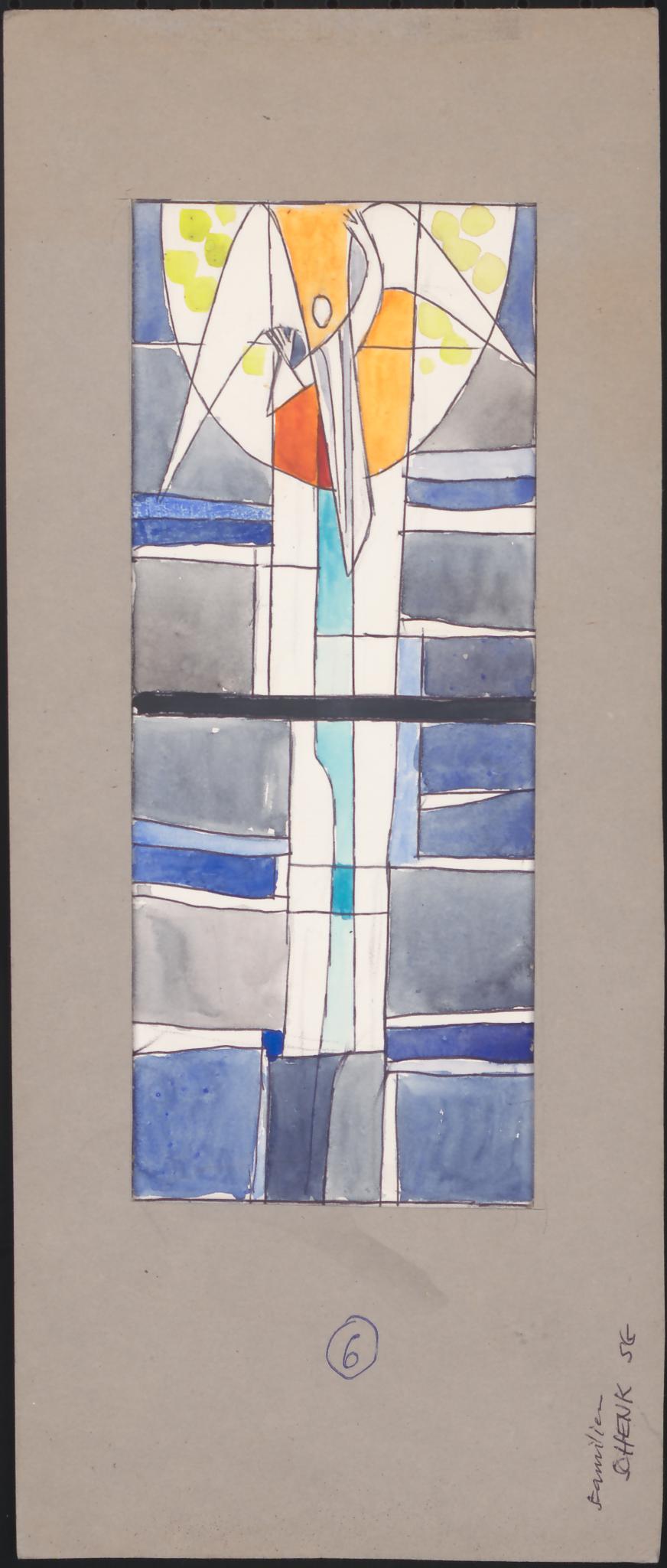 Entwurf für ein hochrechteckiges Fenster: Im oberen Bilddrittel schwebt ein Engel mit ausgebreiteten Flügeln vor einer Sonne, deren Fläche gelb gepunktet ist. Von dem Himmelskörper geht ein heller vertikaler Lichtstrahl aus, der die dunklen Flächen in Grau- und Blautönen zu verdrängen scheint.