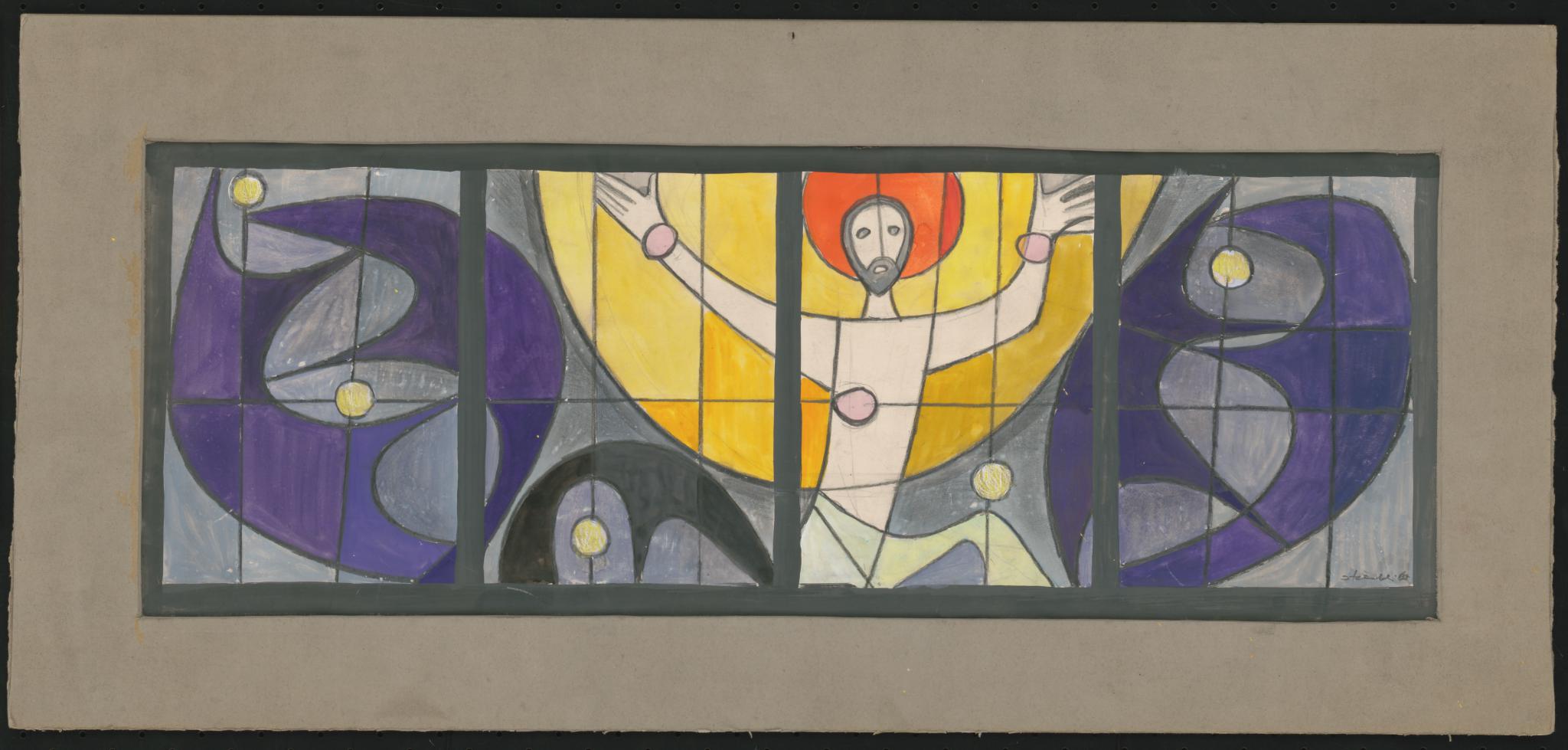 Entwurf für ein querrechteckiges vierteiliges Fenster, das den auferstandenen Christus zeigt. Sein weisser, langgezogener Körper steht im Zentrum der Darstellung. Christus hat die Arme ausgebreitet, der Kopf wird von einem roten Nimbus umfangen, während der Oberkörper in einem gelben halbkreisförmigen Lichtkreis gefasst ist. Seitlich rahmen zackige Bogenformen in dunklen Violetttönen den mittleren Halbkreis in strahlendem Gelb und verleihen der Darstellung Kontrast, aber auch etwas düsteres. Stigmata und Sterne (?) sind als helle kleine Kreise ausgeführt.