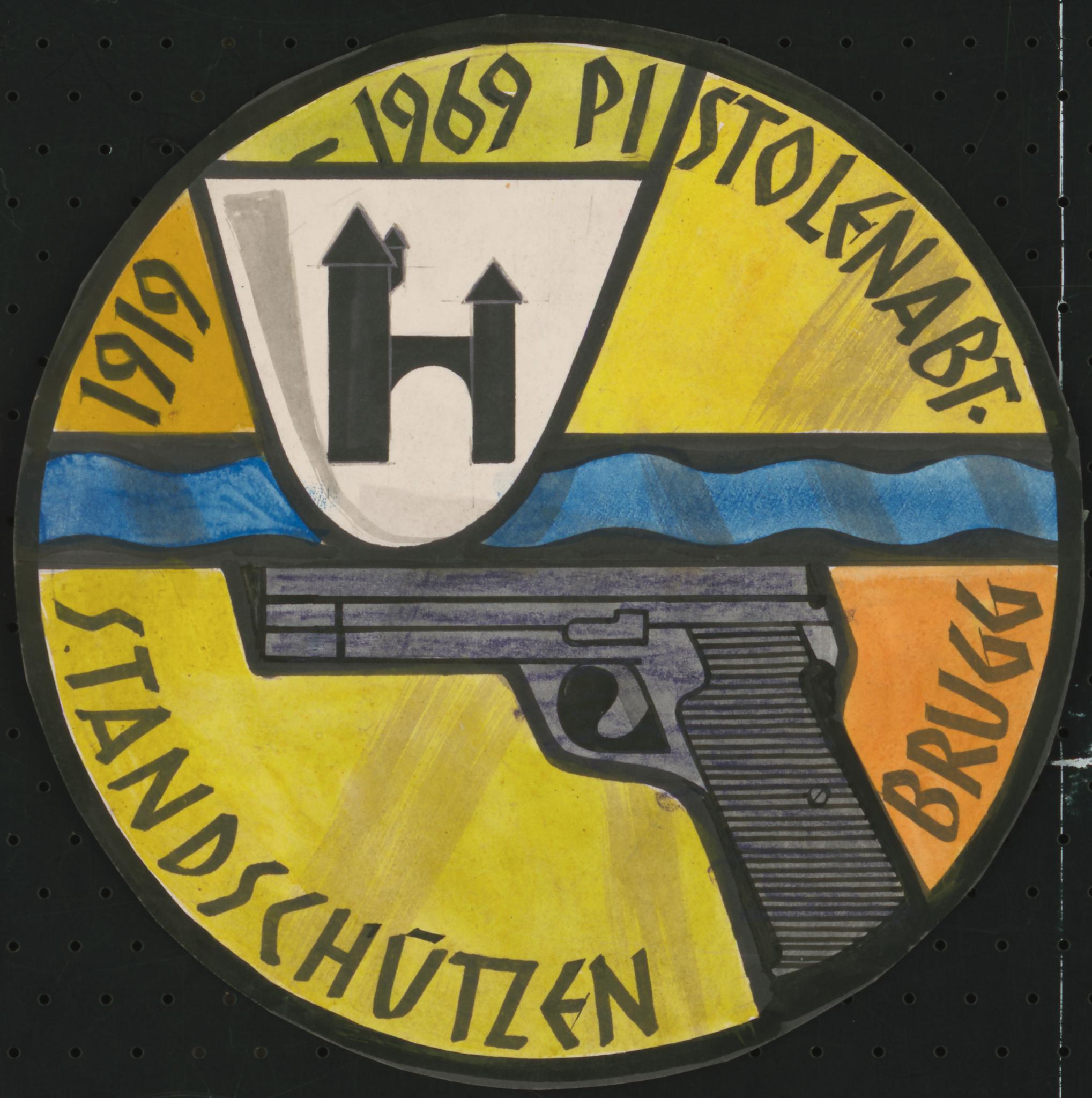 Farbiger Entwurf für eine runde Wappenscheibe mit umlaufender Inschrift. Die Zeichnung zeigt eine moderne Handfeuerwaffe vor gelbem Grund, darüber ein blaues wellenförmiges Band (Symbol für den Fluss Aare) und der Wappenschild der Gemeinde Brugg AG auf weissem Grund.