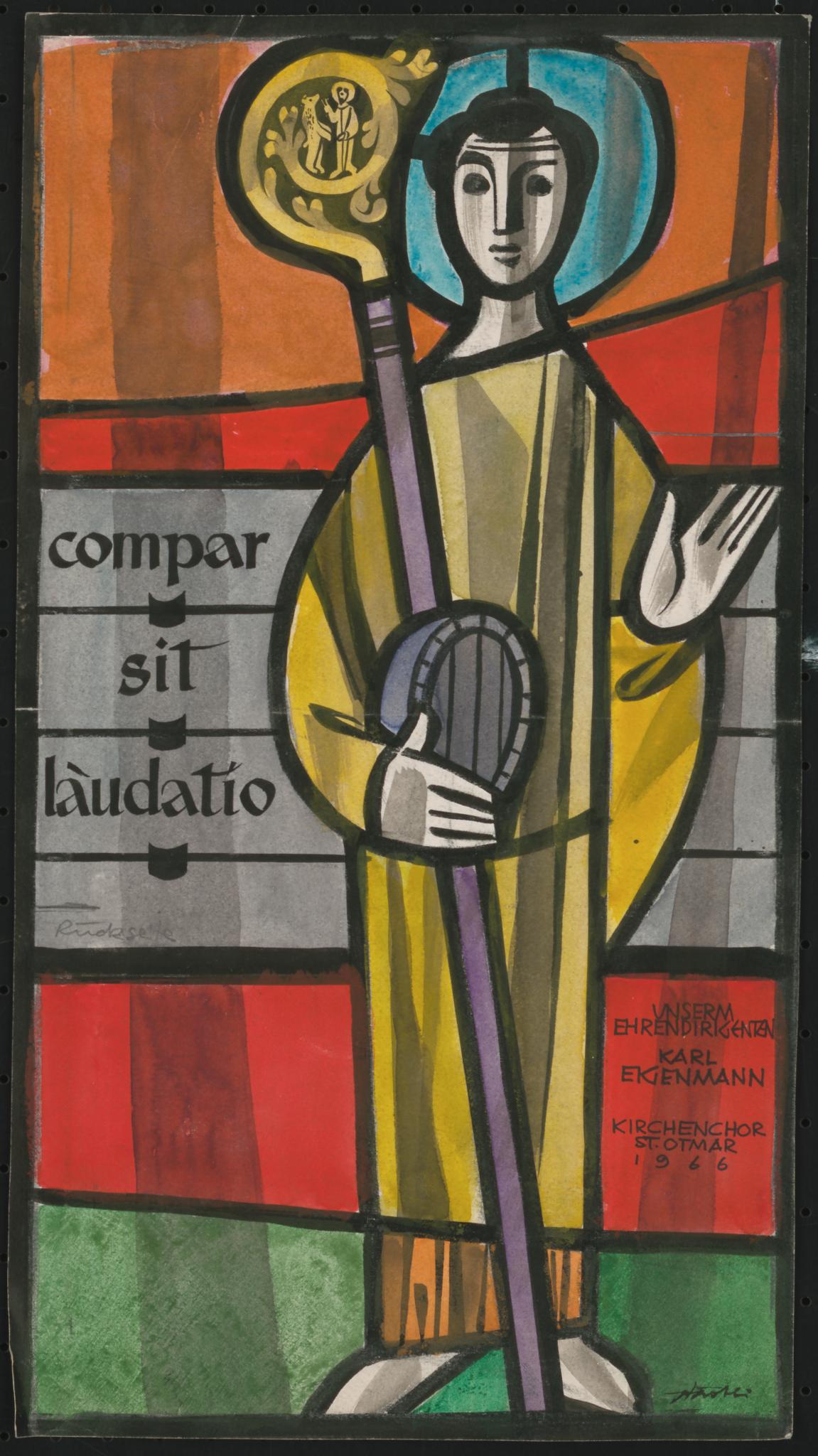 Im Zentrum der Zeichnung steht der heilige Otmar mit Fass. Sein Krummstab zeigt in der Krümme eine Miniatur des heiligen Gallus mit Bär. Im Hintergrund ein flächiges graues Band mit der als Notation dargestellten Inschrift «compar sit laudatio» («Ehre der Dreieinigkeit») des Hymnus Tantum Ergo, aus dem von Thomas von Aquin verfassten Hymnus Pange lingua.