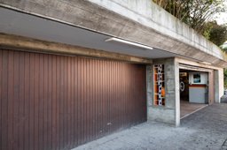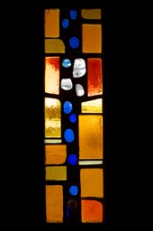 Vertikales Betonglasfenster bestehend aus grossen, flachen Gussglasstücken in Gelb- und Orangetönen. Eine breite Betonfuge verläuft mittig durch das Fenster, in die runde weisse und blaue Dallglasstücken, die teilweise kristallförmig zugeschlagen sind, eingelassen sind. Rückseitige befindet sich eine Vorrichtung für die elektrische Beleuchtung der Betonverglasung mittels einer einfachen Glühbirne.