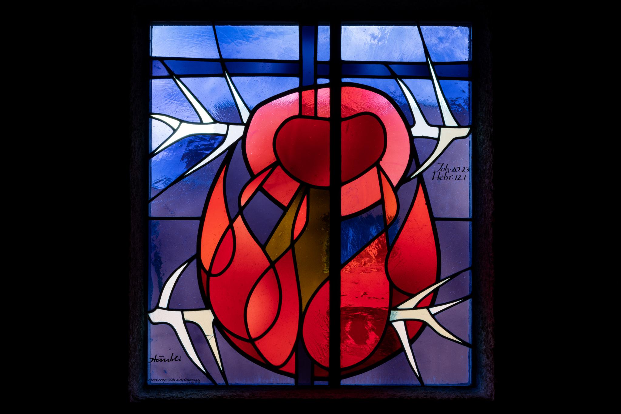 Quadratische Glasmalerei: Vor dunkelblaume Hintergrund ein Herz, das von Flammen umzüngelt und von weissen spitzigen Dornen gerahmt wird, die sich stark vom dunklen Hintergrund absetzen. Ein dunkelblaues Kreuz gliedert die Scheibe, an dem eine breite vertikale Metallsprosse (anstelle eines Windeisens) parallel entlang geführt wird. Die beigegebenen Bibelstellen (Joh. 20.23; Hebr. 12.1) verweisen auf den Sündenerlass, dessen Voraussetzung die Beichte ist. So zeigt die Darstellung die Läuterung des Herzens im reinigenden Feuer. Das dornenumrankte Herz verweist sowohl auf das Leiden Christi wie auch die Sünden der Menschheit.