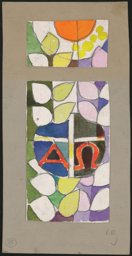 Das zweiteilige Fenster zeigt eine orangefarbene Sonne auf weissem Grund, zwei stilisierte Blütendolden, einen Vogel im Flug, darunter einen Flussverlauf zwischen Vegetation und in der rechten unteren Ecke eine schwarz-weisse Spirale.