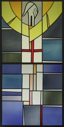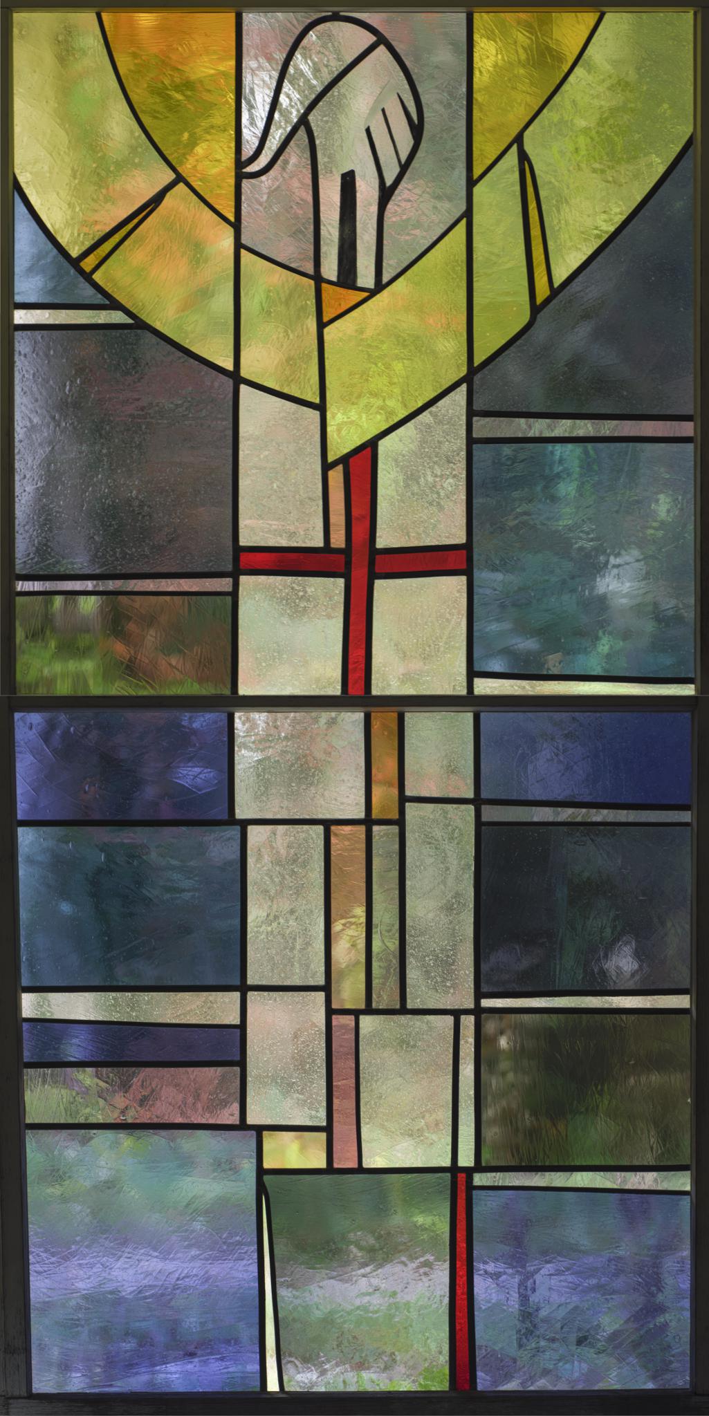 Der Entwurf zu diesem Fenster (HS_429) zeigt im Wesentlichen die ausgeführte Arbeit, ausser dass die Hand gespiegelt wurde und die Glasmalerei farbiger gestaltet wurde als der Entwurf, in welchem Blau- und Violetttöne mit den grauen Flächen variieren.