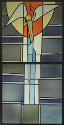 Der Entwurf zu diesem Fenster (HS_431) zeigt im Wesentlichen die ausgeführte Arbeit mit wenigen Abweichungen: die Sonne war mittels gelben Punkten stärker ausgearbeitete und der Engelskopf wesentlich kleiner proportioniert, wobei der Körper stärker ausgearbeitet war.
