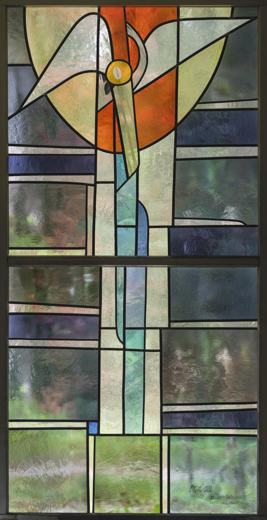 1959/60 wurde die Ostseite und der vormalige Salon der Villa nach den Plänen des St. Galler Architekten Hans Burkard (1895–1970) zu einer Kapelle mit rechteckigem Chor und Sakristeiraum ausgebaut. Der neue Kapellenanbau sah je drei bodentiefe Fenster an der Nord- und Südseite vor. Es gibt keine Informationen über die bauzeitliche Verglasung oder den Zustand um 1959/60. Heinrich Stäubli entwarf und realisierte den farbigen Fensterzyklus mit abstrakten und figürlichen Darstellung für die Kapelle, zu dem dieses Fenster gehört, erst im Jahr 1990.
