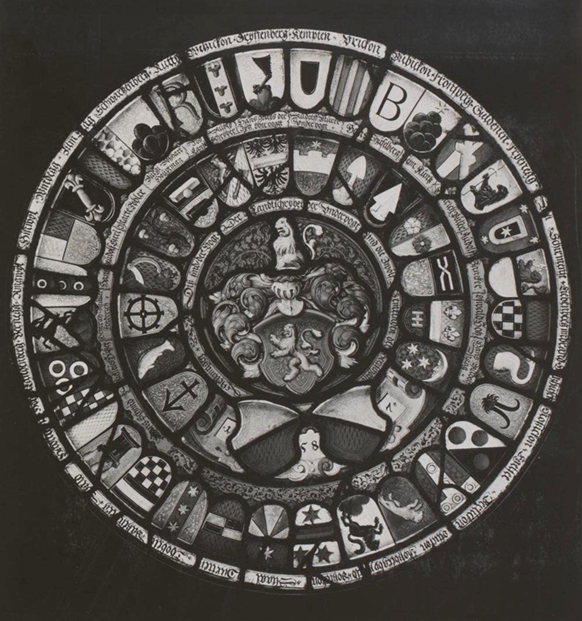 La mise en page de ce vitrail s’inscrit dans la tradition des vitraux de bailliage de format rond bien établie dans l’ancienne Confédération suisse et pour lesquels plusieurs modèles dessinés nous sont parvenus.